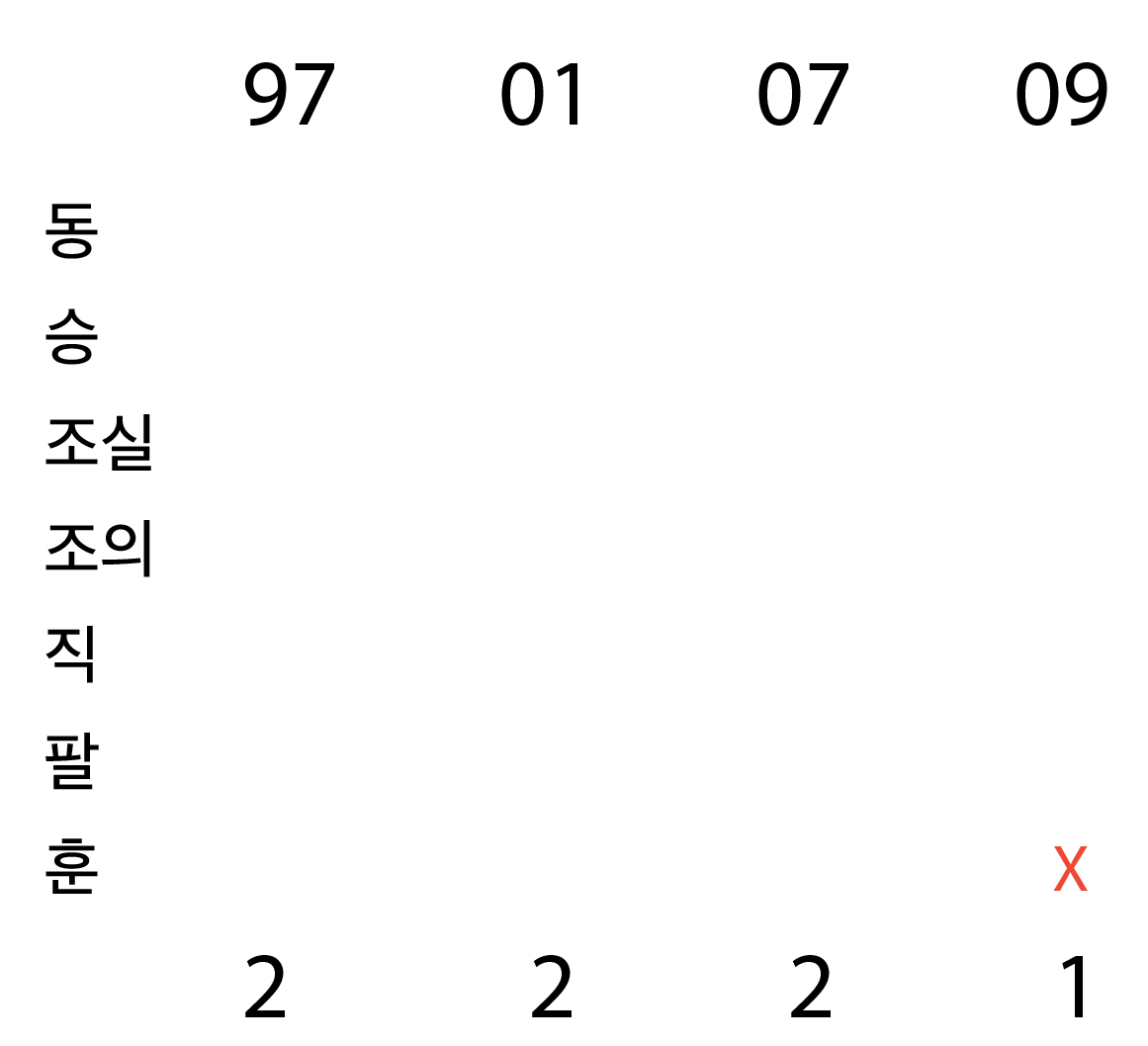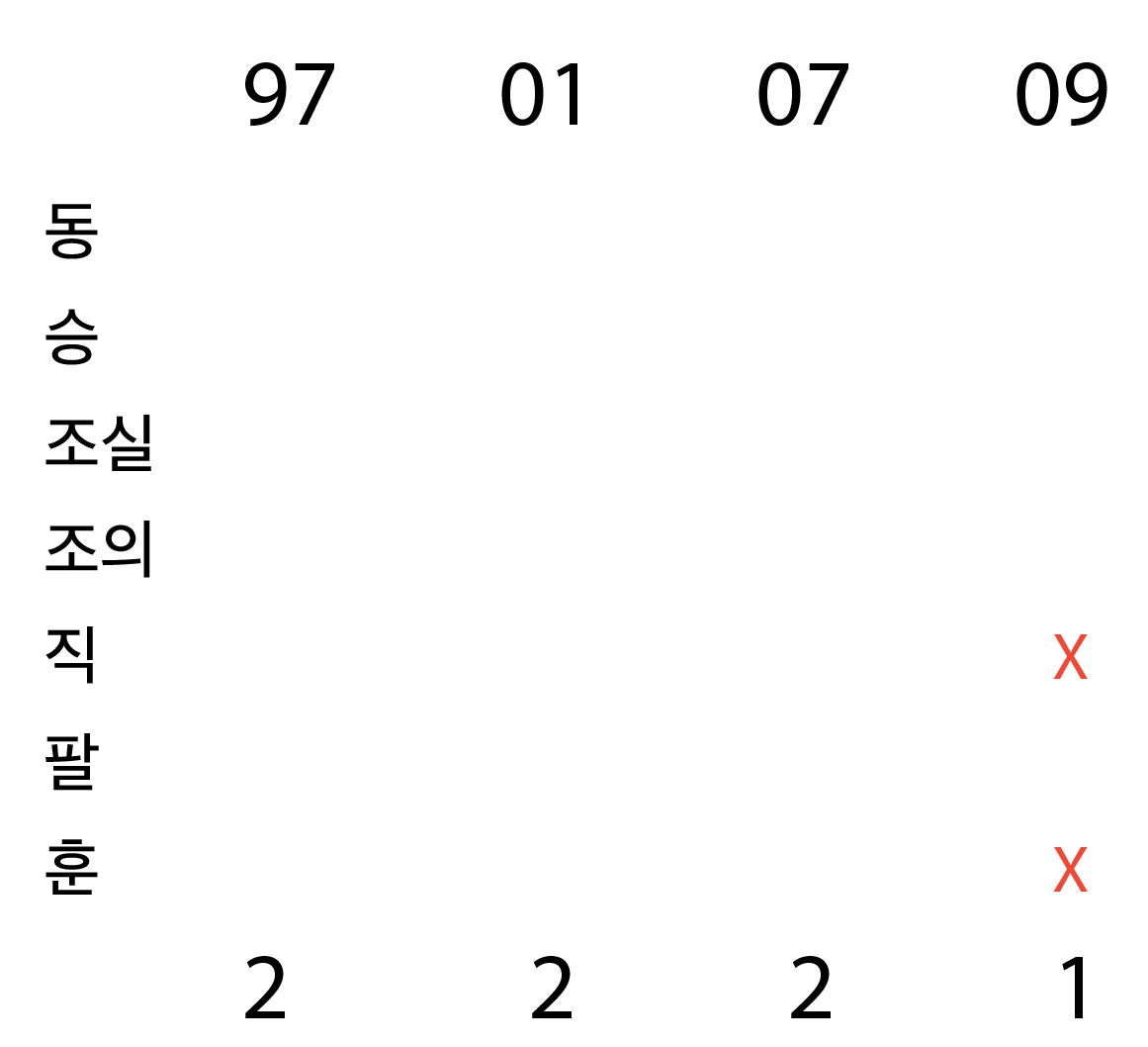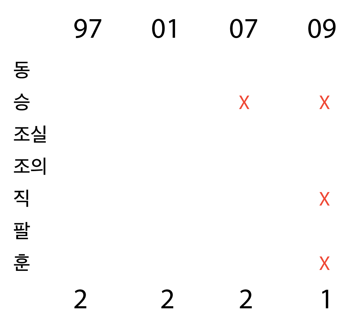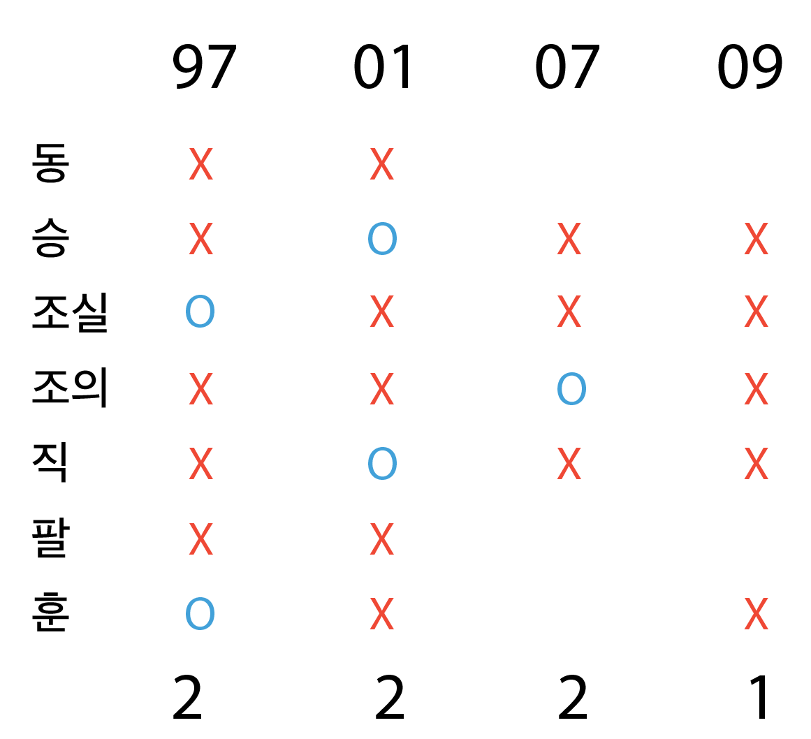 이를 통해 10년도에는 지정된 게 없고, 위 4개 연도만 고려하면 됨을 알 수 있다 .