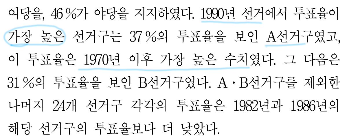 1990년 선거에서 A선거구의 투표율이 가장 높다고 했고,