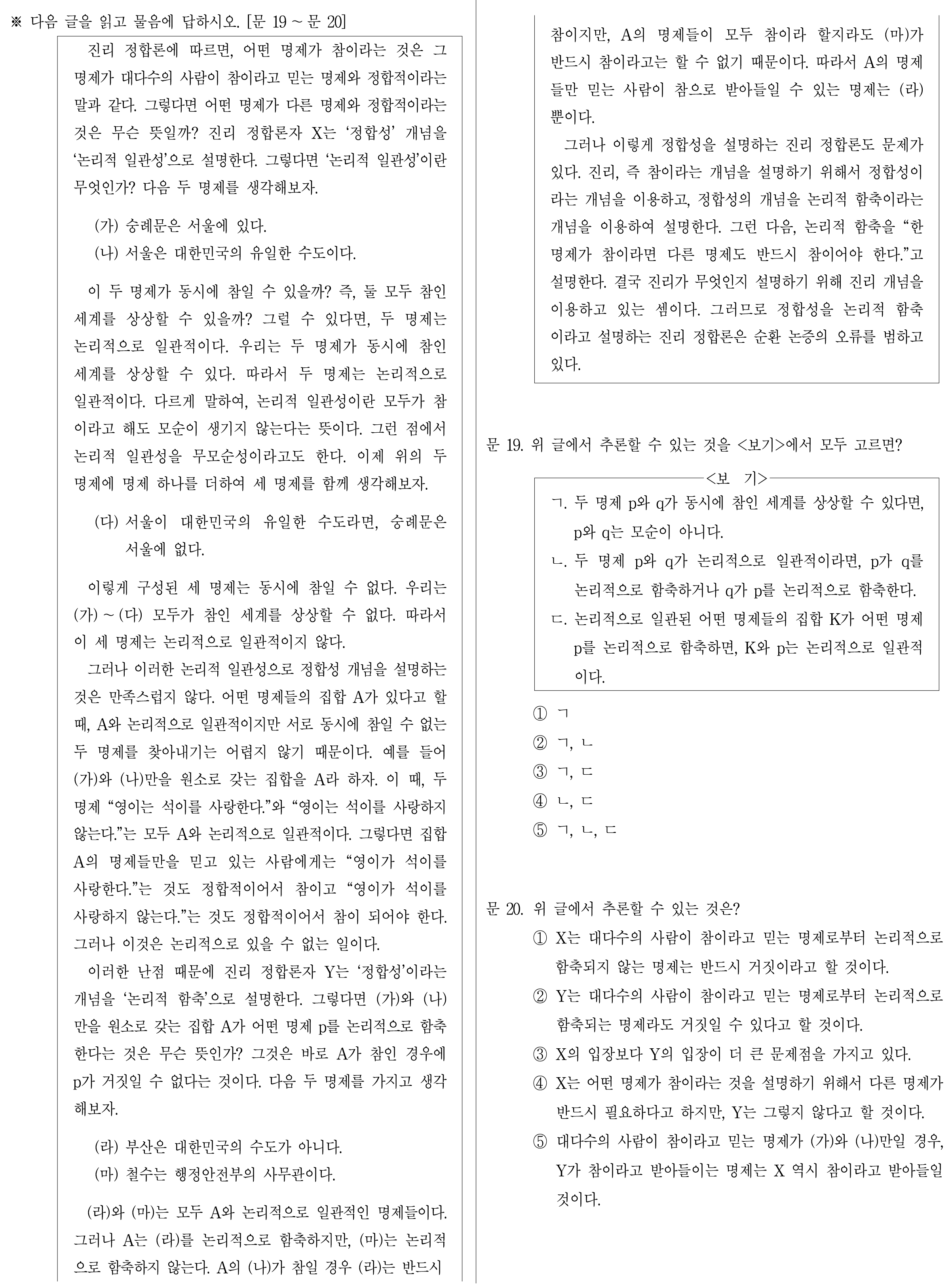 (가)와 (나)라는 두 명제를 가져와서 논리적 일관성을 설명하고 있는데,