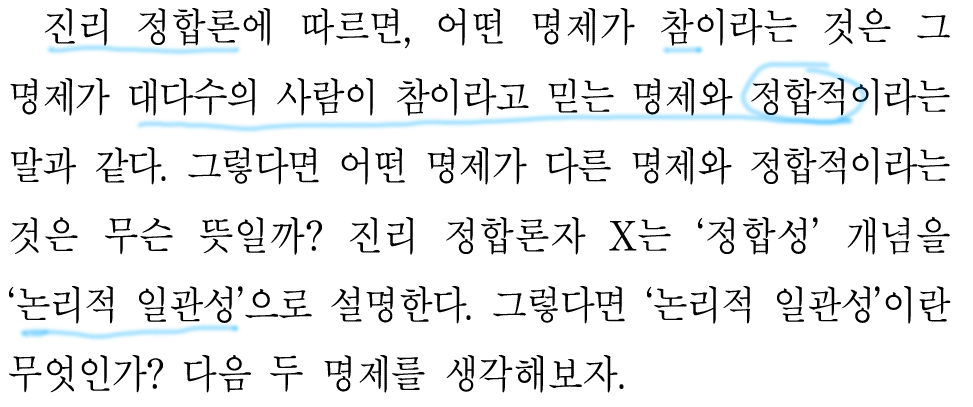 진리 정합론자 X는 정합적이라는 것을 논리적 일관성이라고 한다.