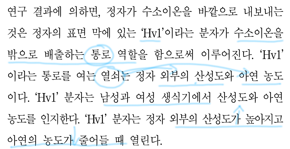 수소이온은 Hv1이라는 분자가 통로 역할을 함으로써 방출된다고 한다.