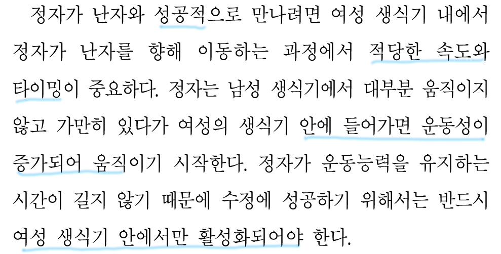 정자와 난자가 성공적으로 만나기 위한 조건을 말하고 있다.