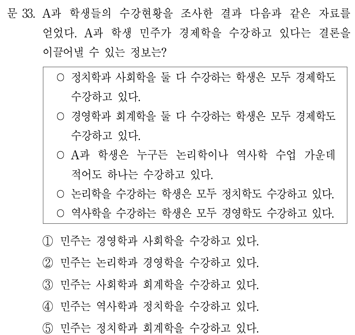 민주가 경제학을 수강하고 있다는 결론으로 이어지는 선지 선택하기