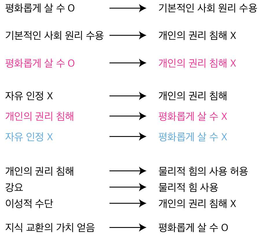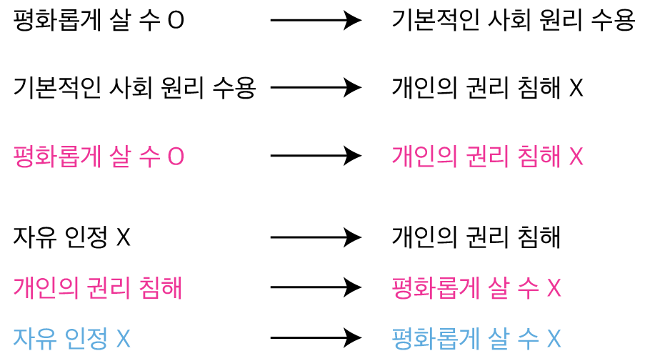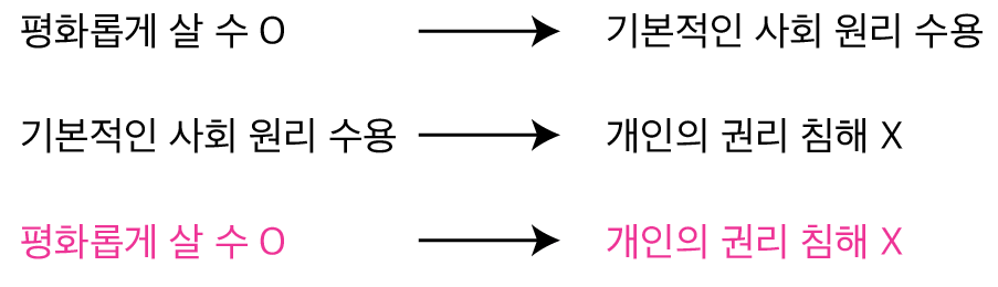 그리고 앞서 살펴본 명제(평화롭게 살 수 있다 -> 개인의 권리 침해 X)를 대우로 바꾸어 보면