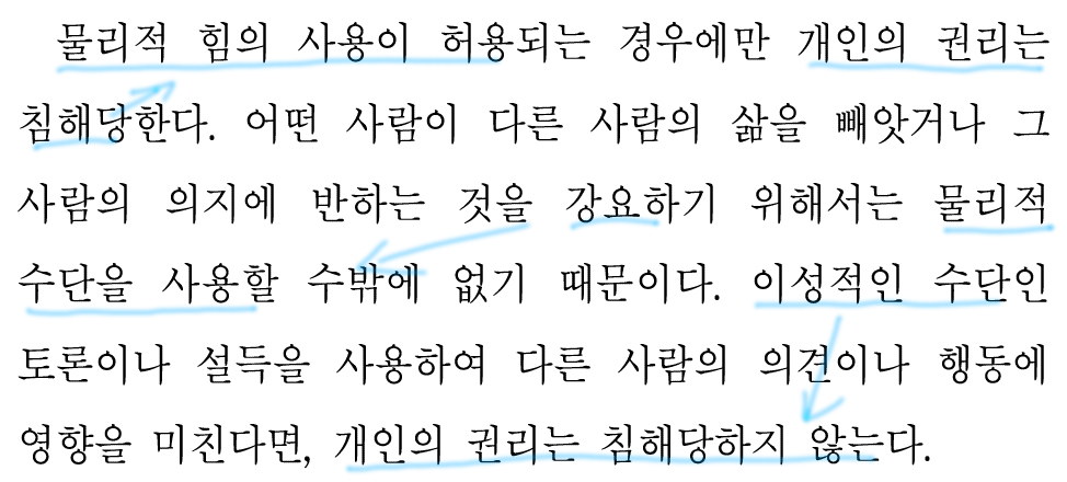 물리적 힘의 사용 허용 X -> 개인의 권리 침해 X