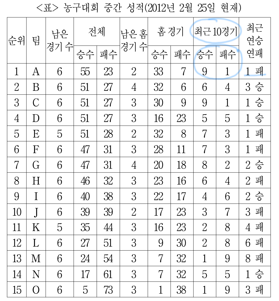 표를 보니 '최근 10경기'라는 항목이 있다.