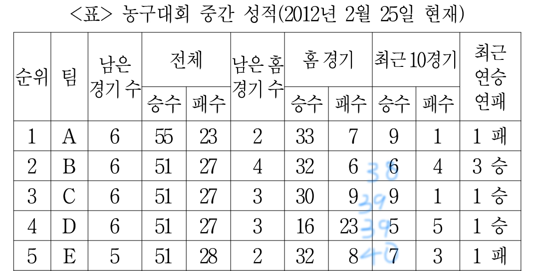 같은 게 있으면 홈 경기 승률로 또 따지면 된다.
