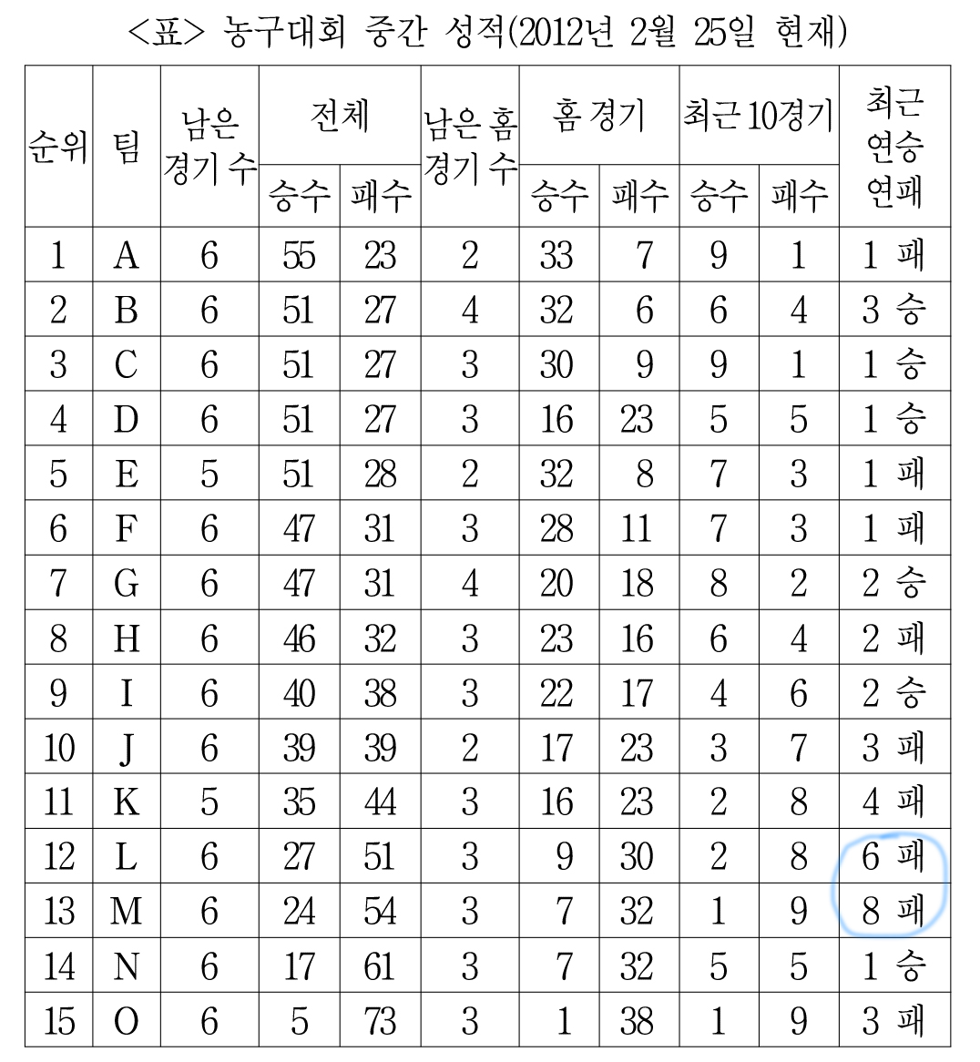 L팀은 6연패를 했고