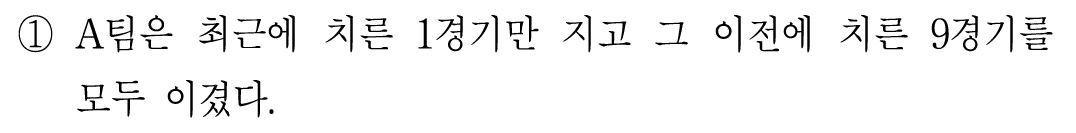 선지에서 나온대로 최근 1경기만 지고 그 이전에 치른 9경기 모두 이겼다는 것이 맞으므로