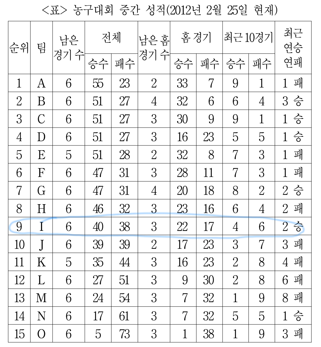 그럼에도 홈경기 승률이 I가 더 높을 수 있으므로 8등이 될 수 있다.