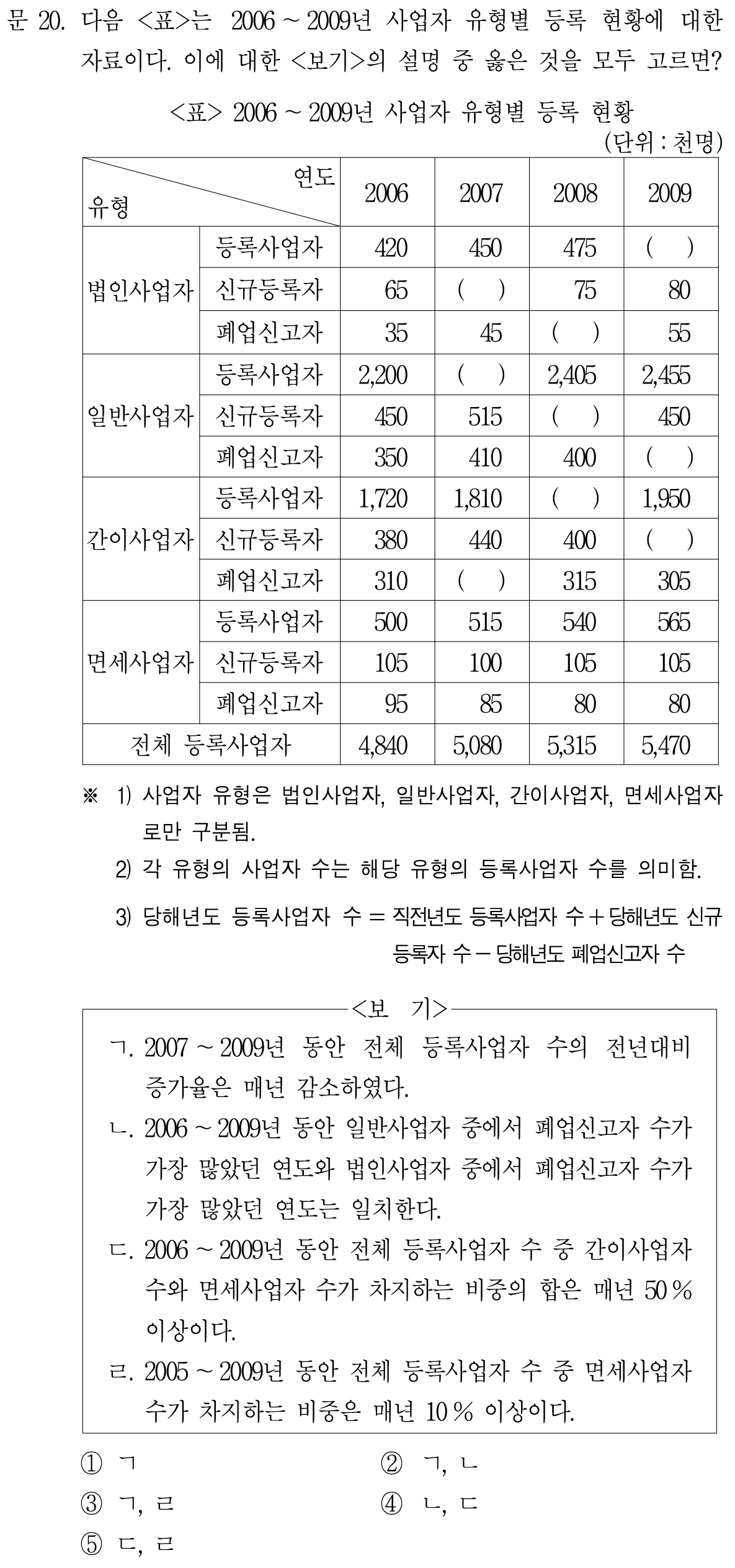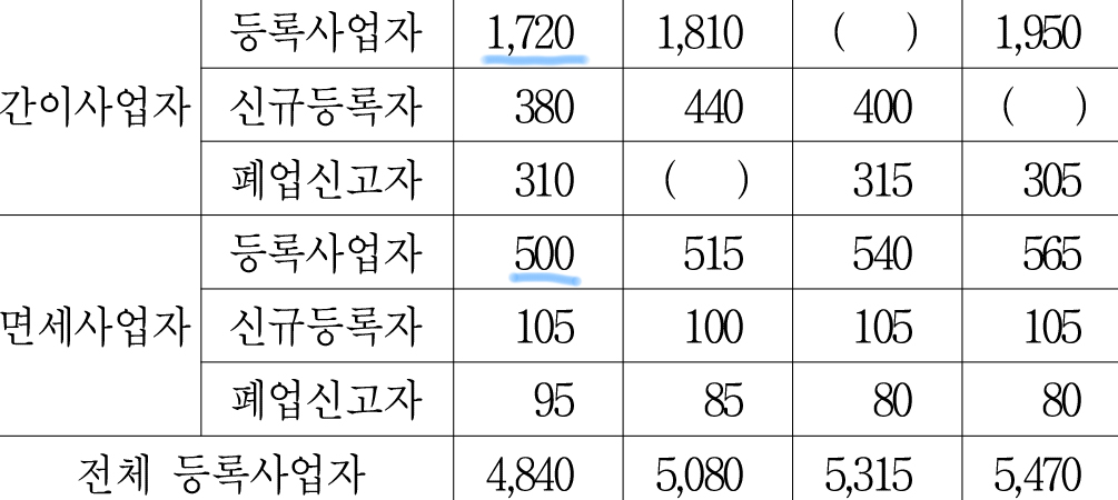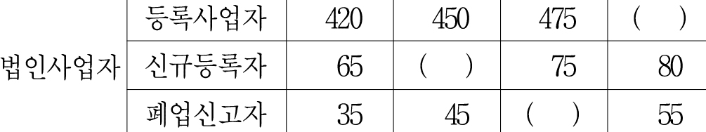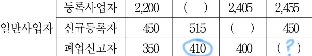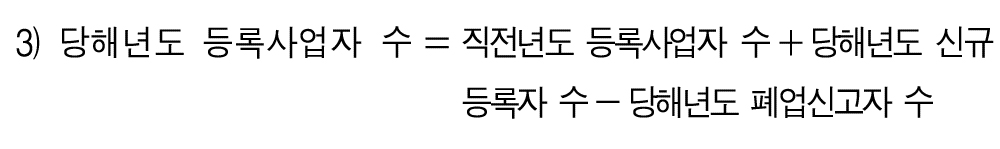 당해년도 등록사업자 수 - 직전년도 등록사업자 수 = 당해년도 신규등록자 수 - 당해년도 폐업신고자 수