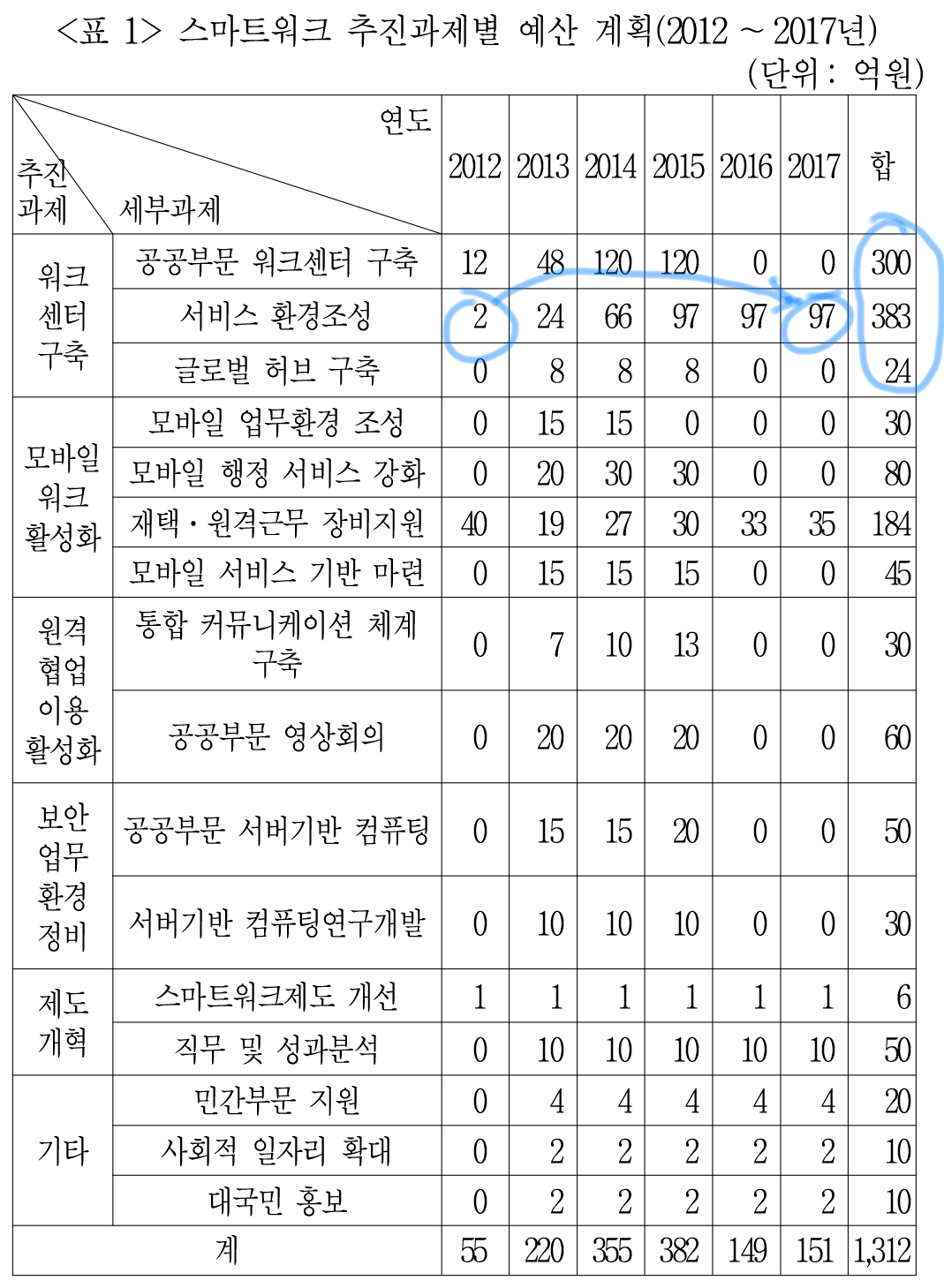 일단 2012-2017 동안 스마트워크 추진 예산이 가장 많이 투입되는 해는 382억을 보이는 2015년이다.