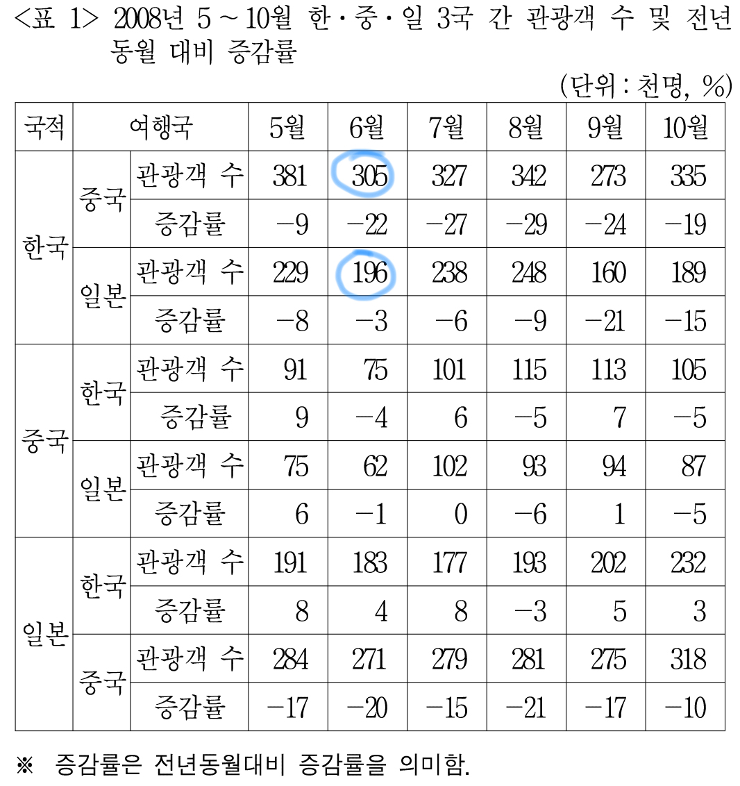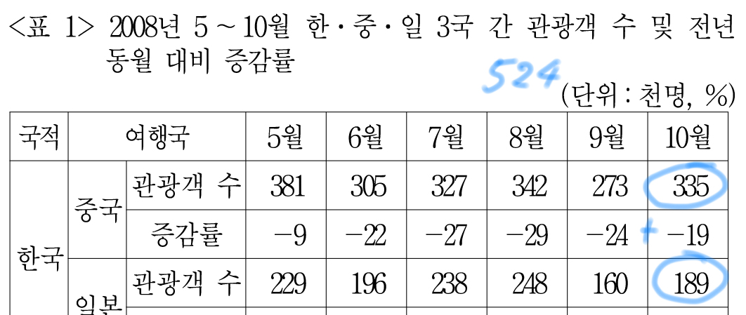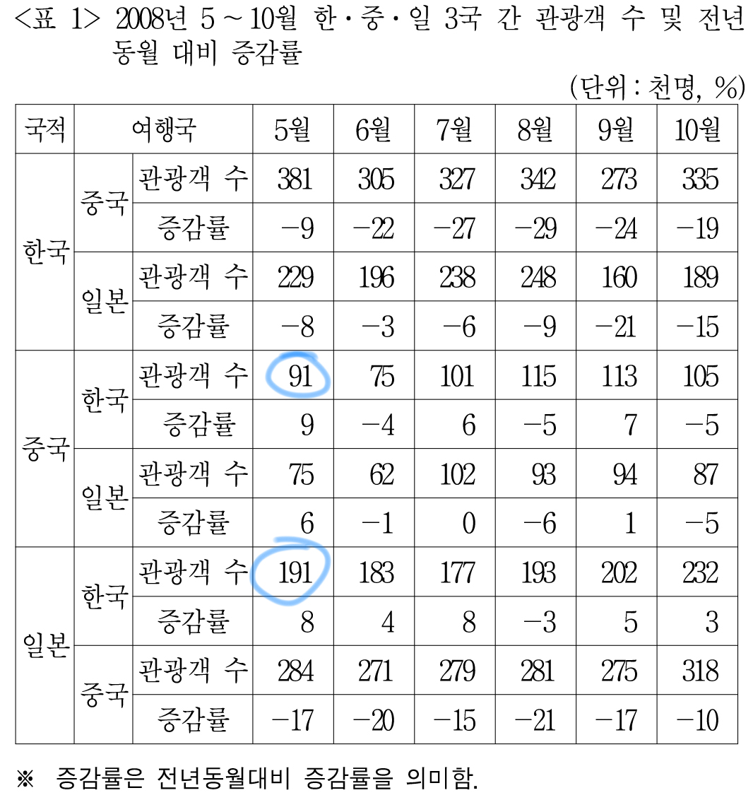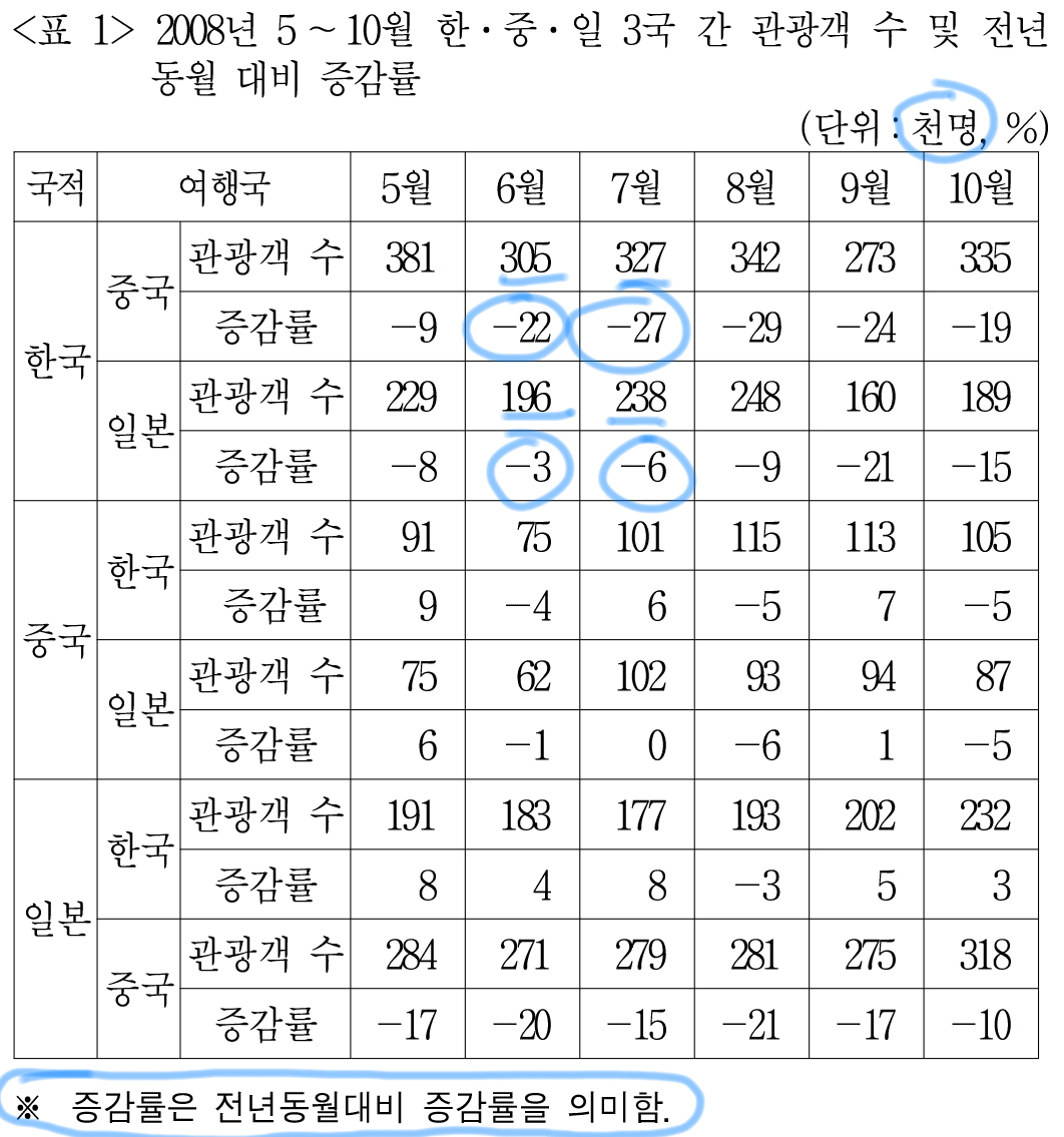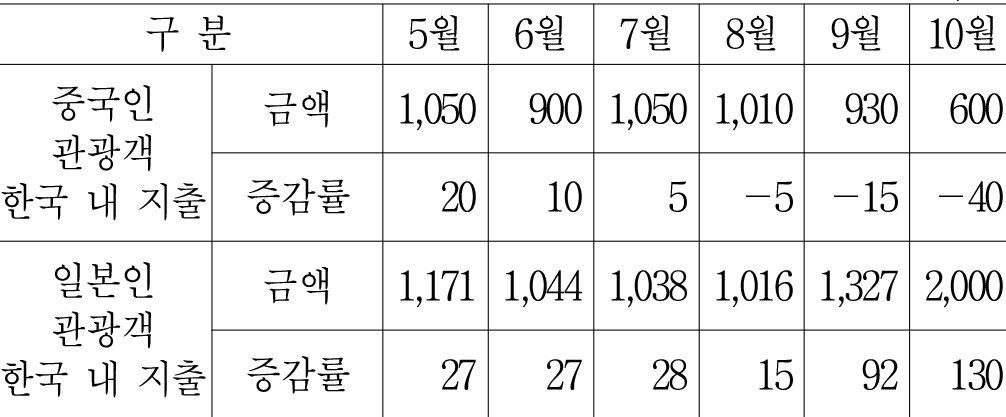 중국, 일본을 방문한 한국 관광객 수는 <표1>에서 확인할 수 있다.