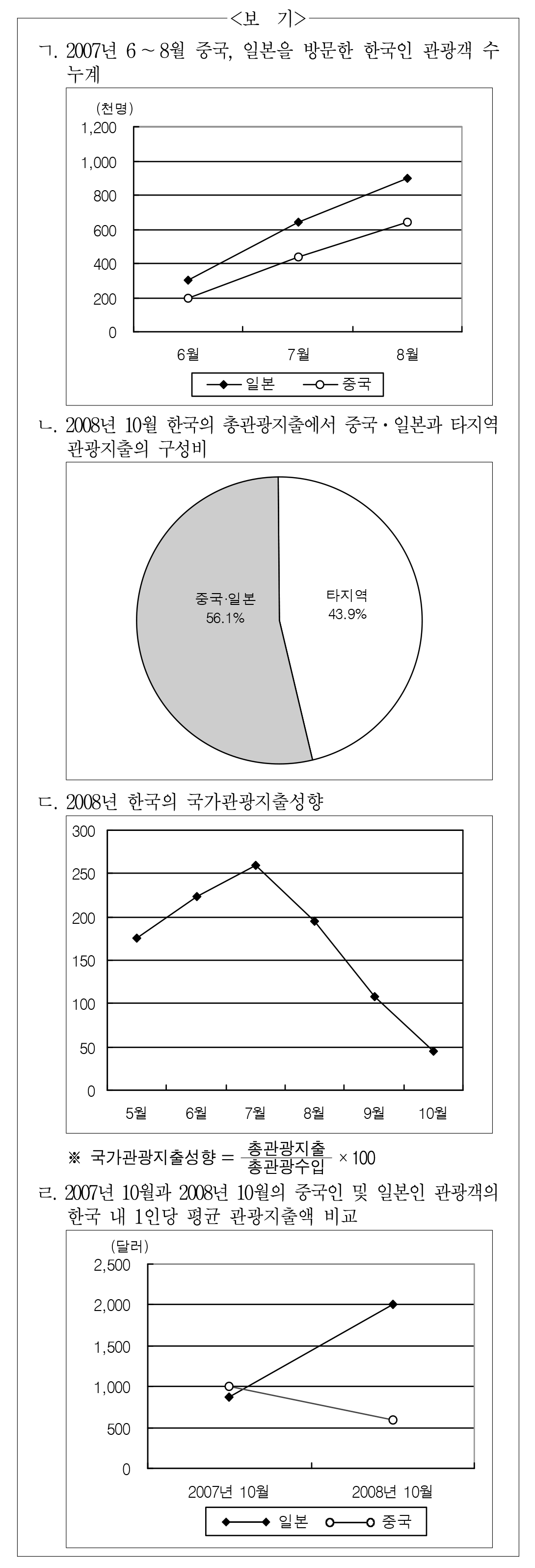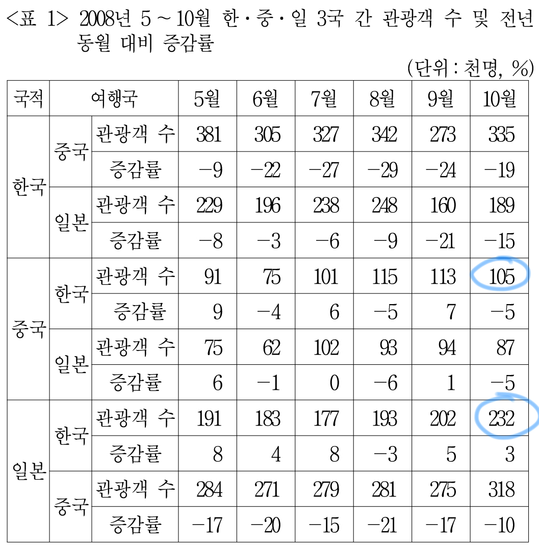 2008년 10월 중국과 일본으로 떠난 관광객 수는 총