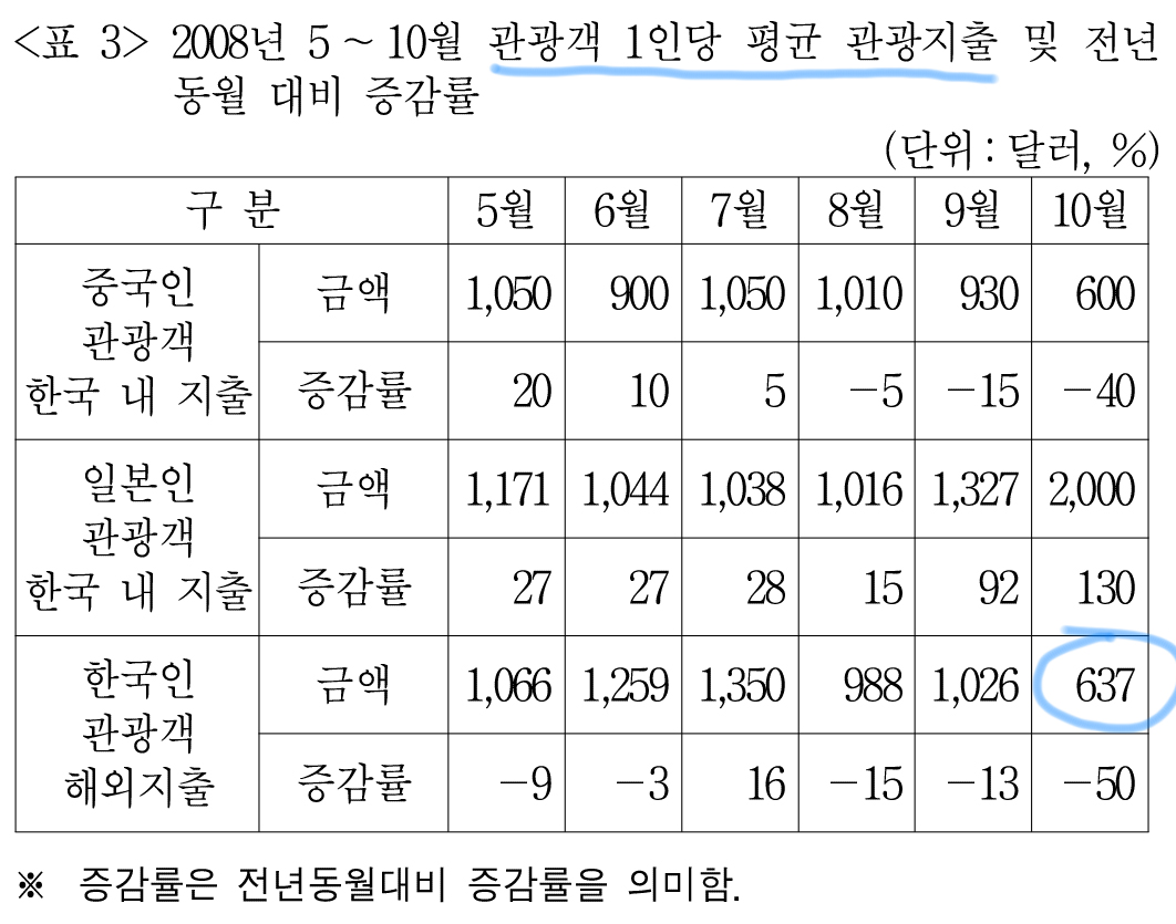 한국인 관광객 1인당 평균 637달러를 썼다고 하므로