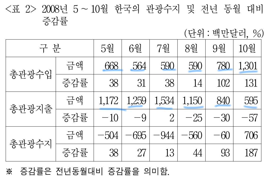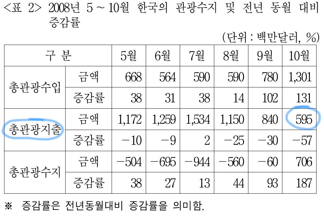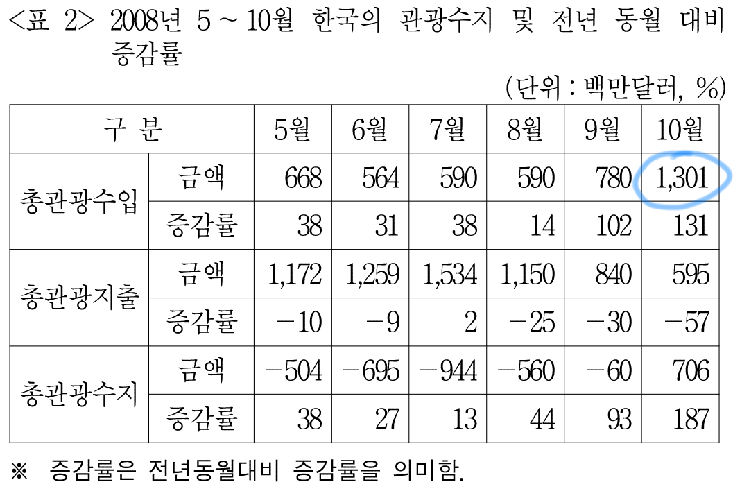 한국의 총관광지출은 <표2>에서 확인 가능하다