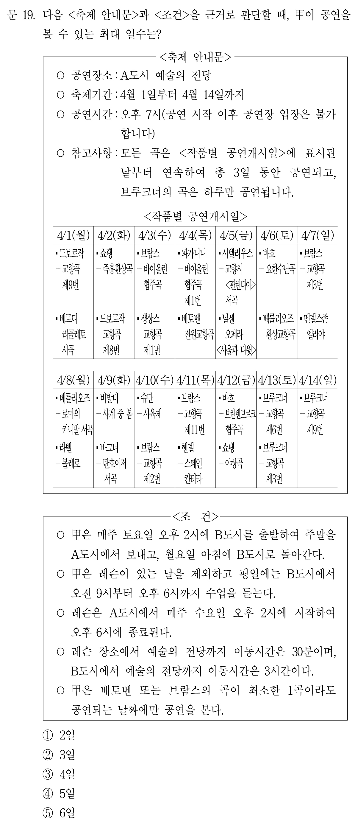 갑은 베토벤 또는 브람스의 곡이 최소한 1곡이라도 공연되는 날짜에만 공연을 본다.