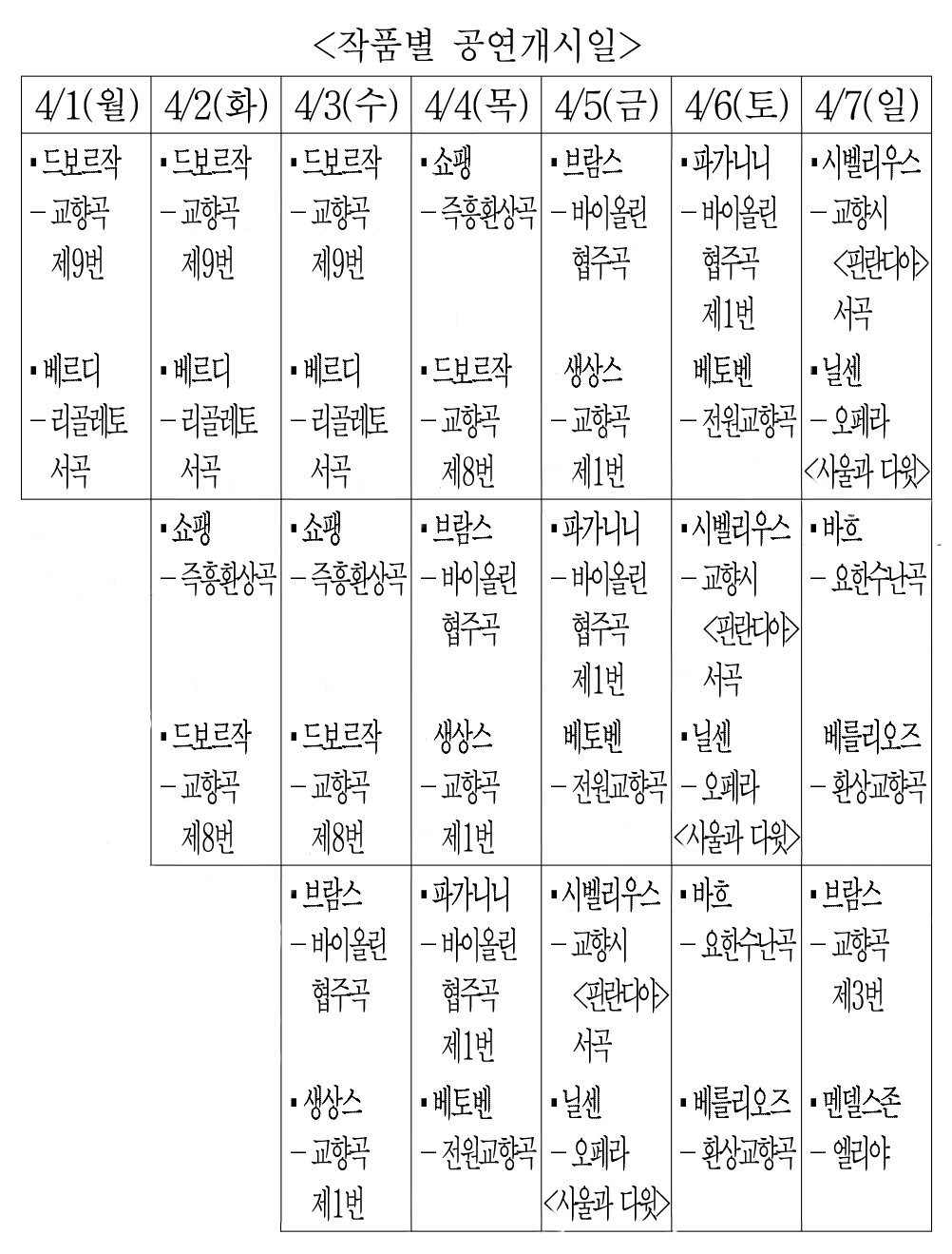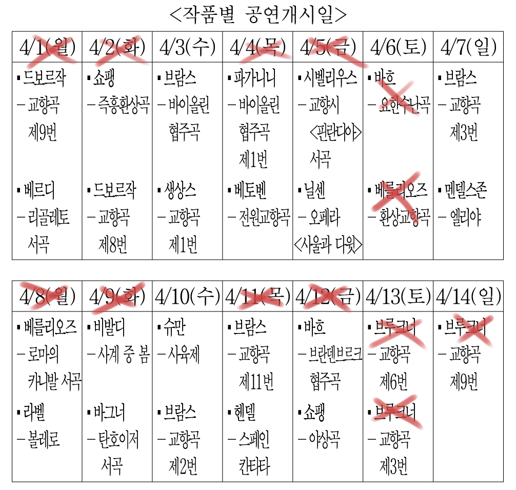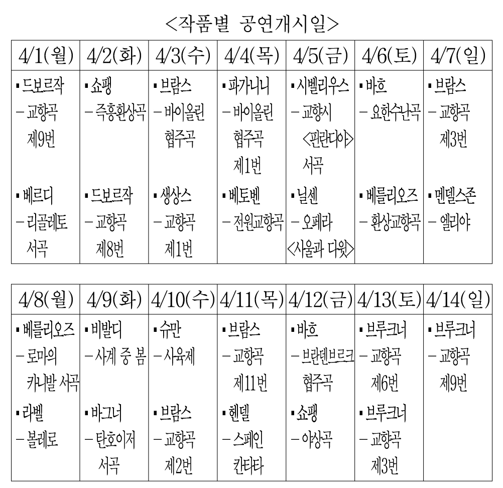모든 곡은 <작품별 공연개시일>에 표시된 날부터 연속하여 총 3일 동안 공연되고, 브루크너의 곡은 하루만 공연됩니다.