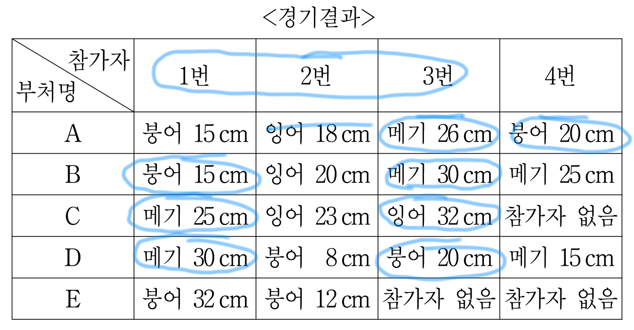 (그냥 물고기 길이만 더해서 가장 큰 부처를 고르면 C인데, 여기서 구하라고 한 것은 기준치를 초과하는 부분이 가장 긴 것을 합산하는 것이기 때문에 C가 될 수 없다.)