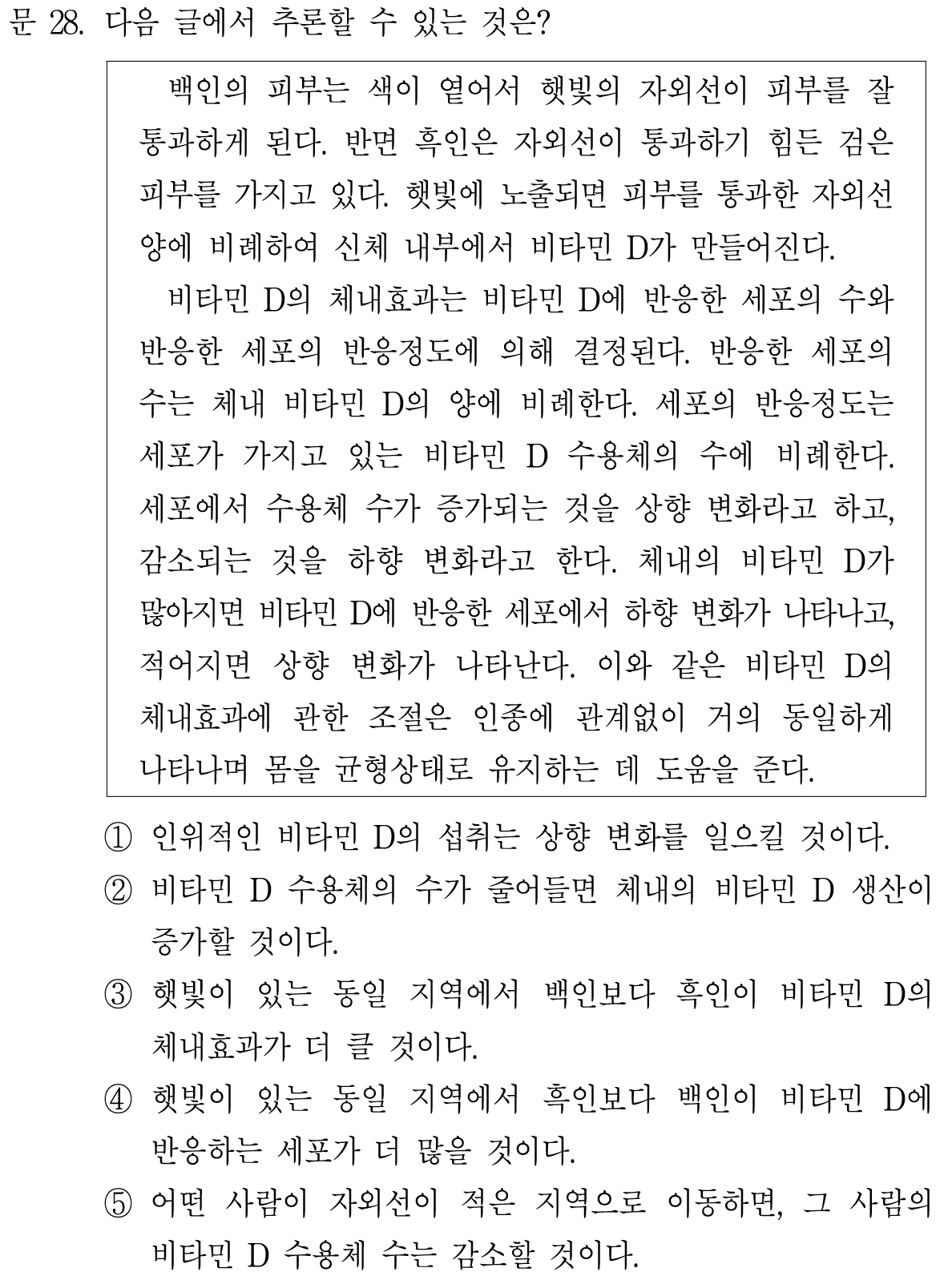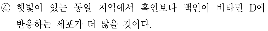 동일한 햇빛에 노출되었을 때, 흑인에 비해 백인 체내에서 비타민 D가 더 많이 만들어진다는 것을 알 수 있다.