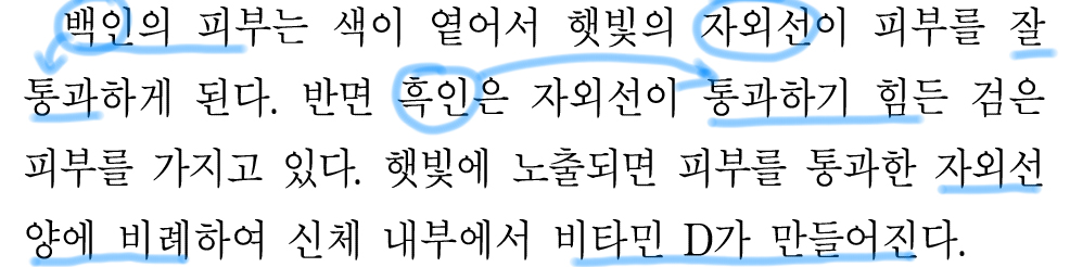 백인의 피부는 흑인의 피부에 비해 자외선이 더 많이 통과되므로 체내에 비타민 D가 많아지고,