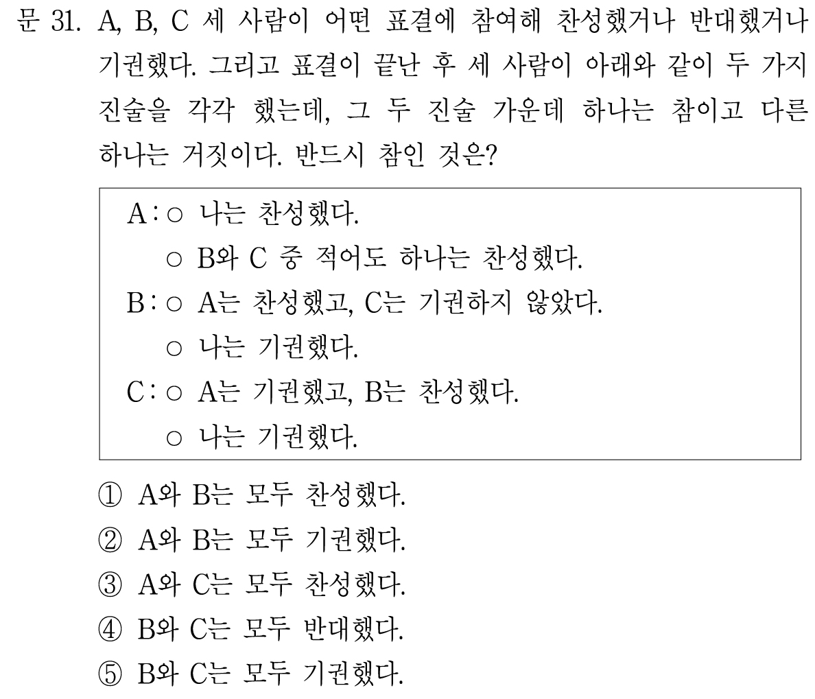 (각 인물의 두 발언이 동시에 참은 아니므로 C는 기각할 수 없고, 그래서 찬/반이어야 한다)
