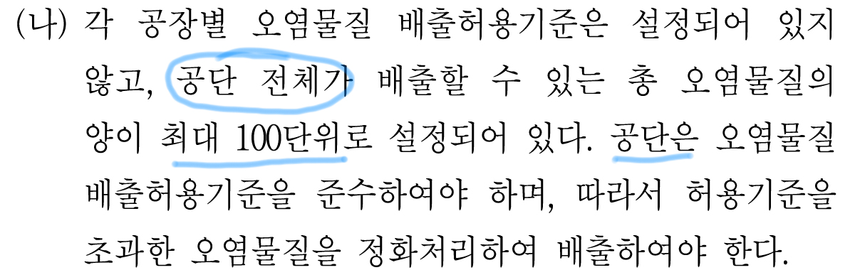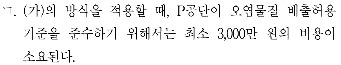 (ㄱ.에서 최소 3000만원이라고 한 것은 (가)에서 배출허용기준이 최대 50단위이라고 했기 때문. 지문에서는 안 나왔지만 어떤 조건으로 인해 49단위까지만 허용한다고 하면 3000만원 이상의 비용이 발생한다.)