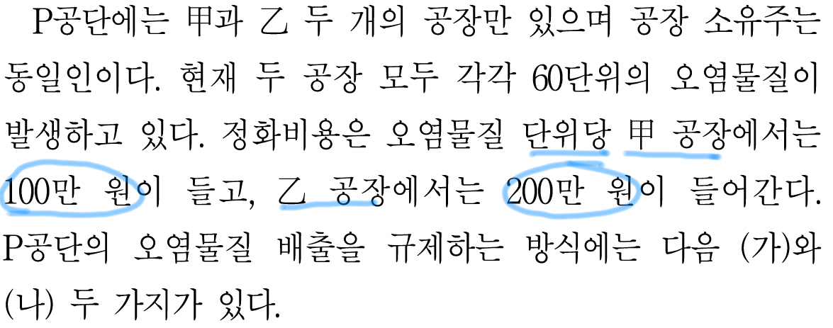 아무튼, (나) 방식을 따를 때, 갑 공장에서 20단위를 정화한다고 하면 100*20 = 2000만원이기 때문에