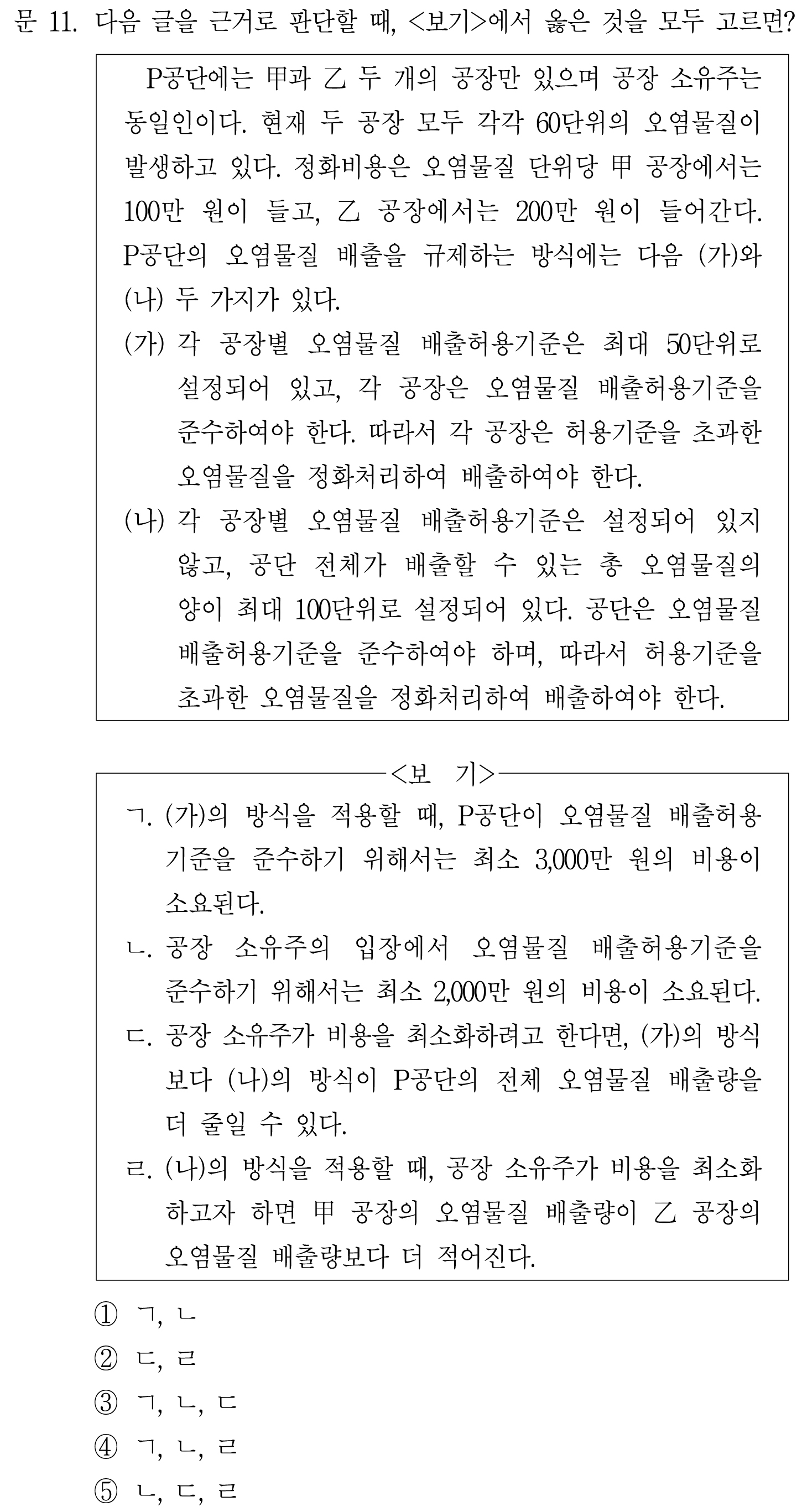 (ㄱ.에서 최소 3000만원이라고 한 것은 (가)에서 배출허용기준이 최대 50단위이라고 했기 때문. 지문에서는 안 나왔지만 어떤 조건으로 인해 49단위까지만 허용한다고 하면 3000만원 이상의 비용이 발생한다.)