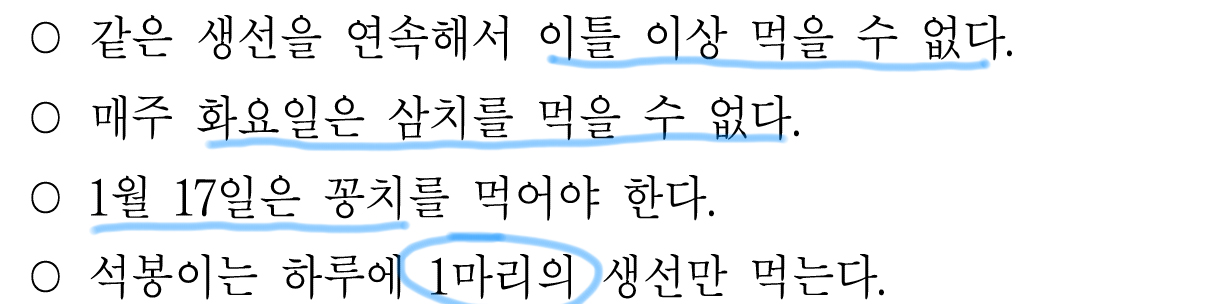 왜냐면 1.6에 꽁치를 먹으면 1.7(화)에 고등어를 먹어야 하기 때문이다.