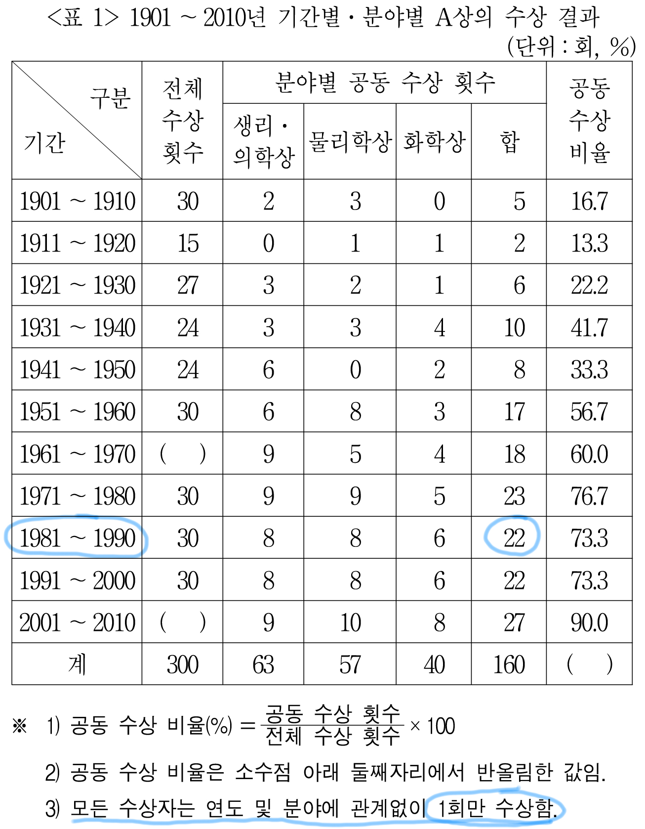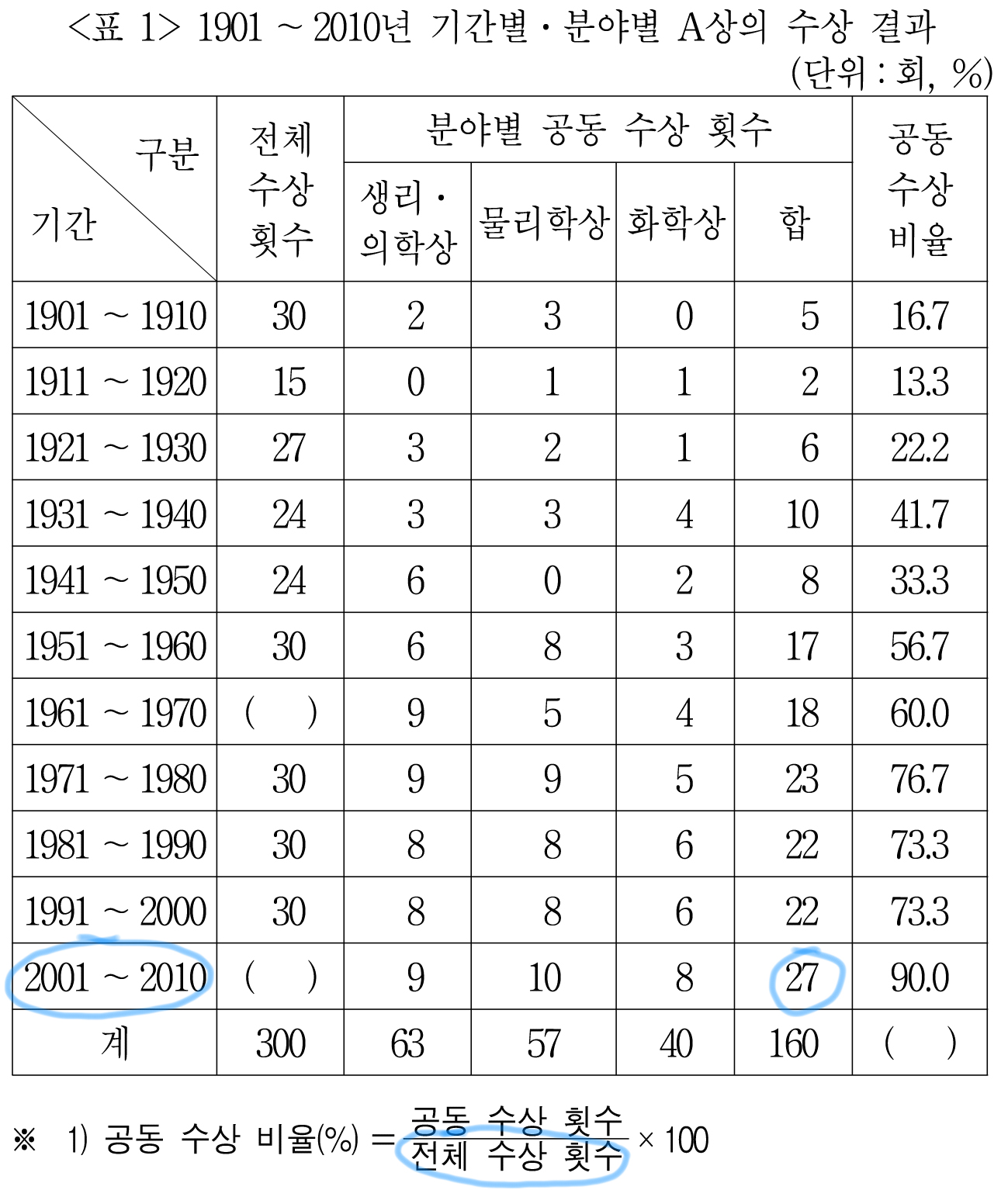 그래서 전체 수상 횟수 = 공동 수상 횟수/공동 수상 비율 이 된다.