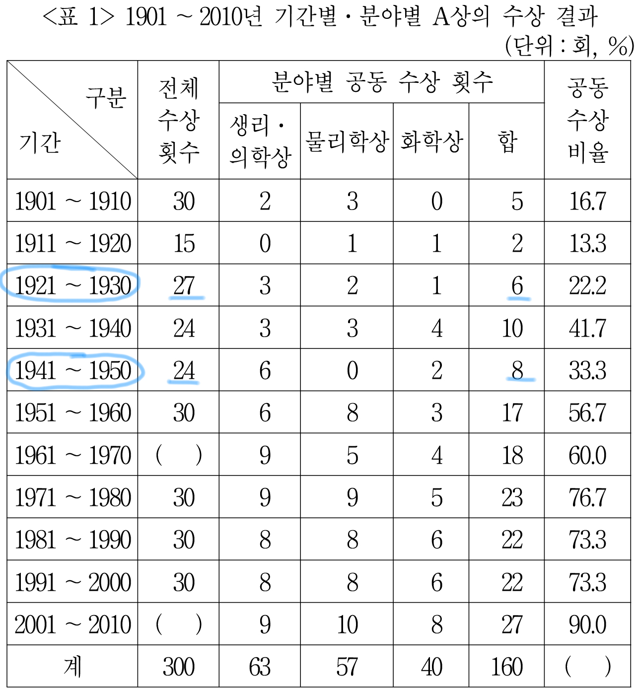 공동 수상 관련해서는 <표1>에서 확인할 수 있다.