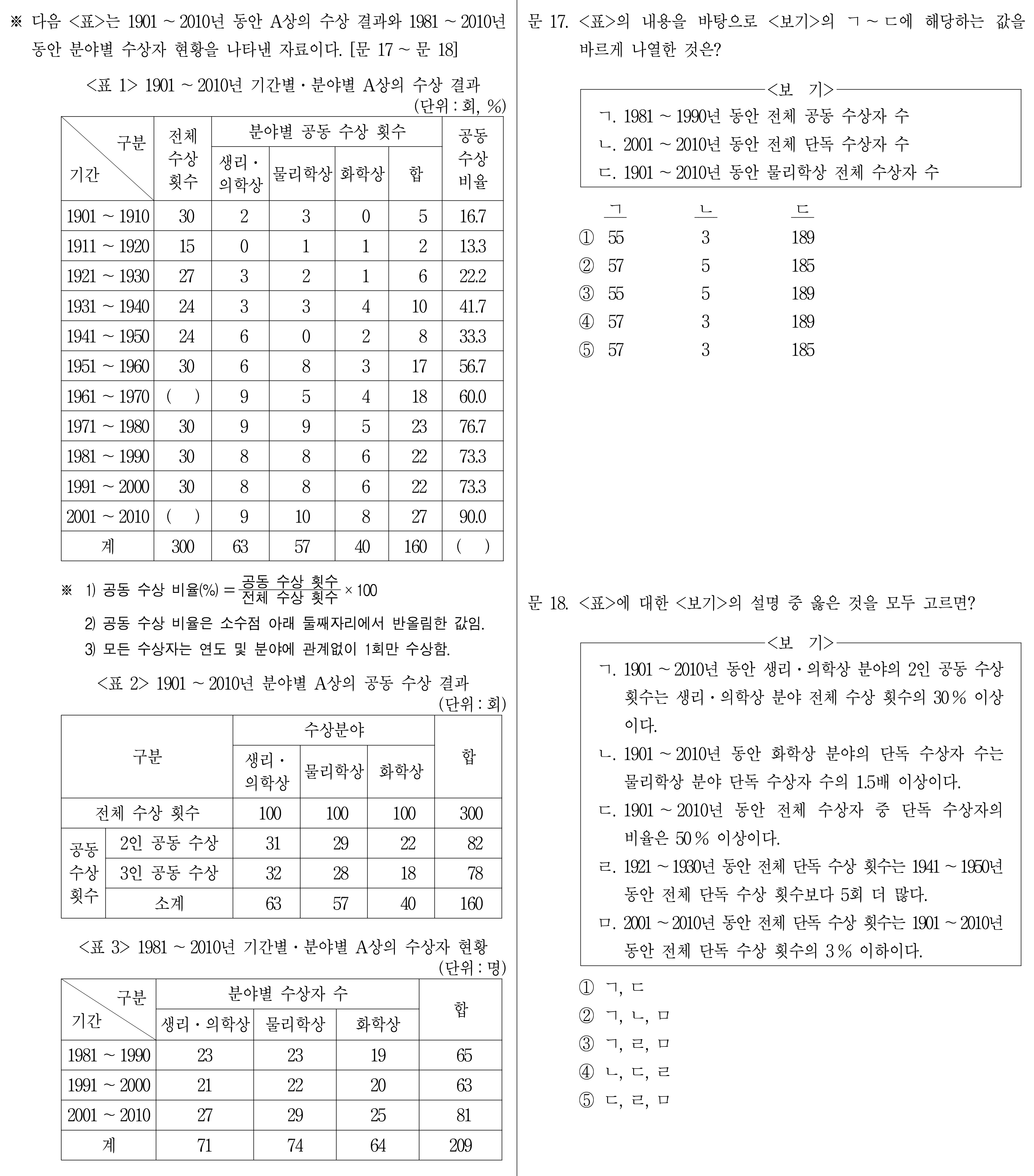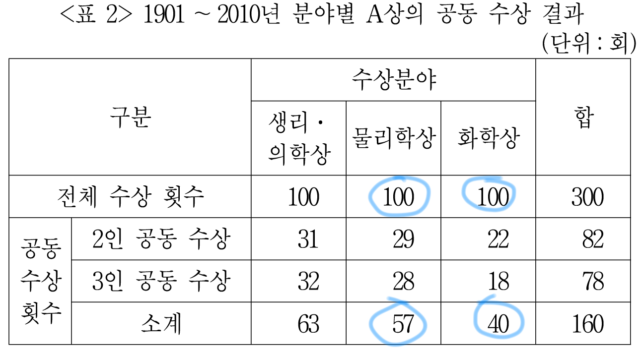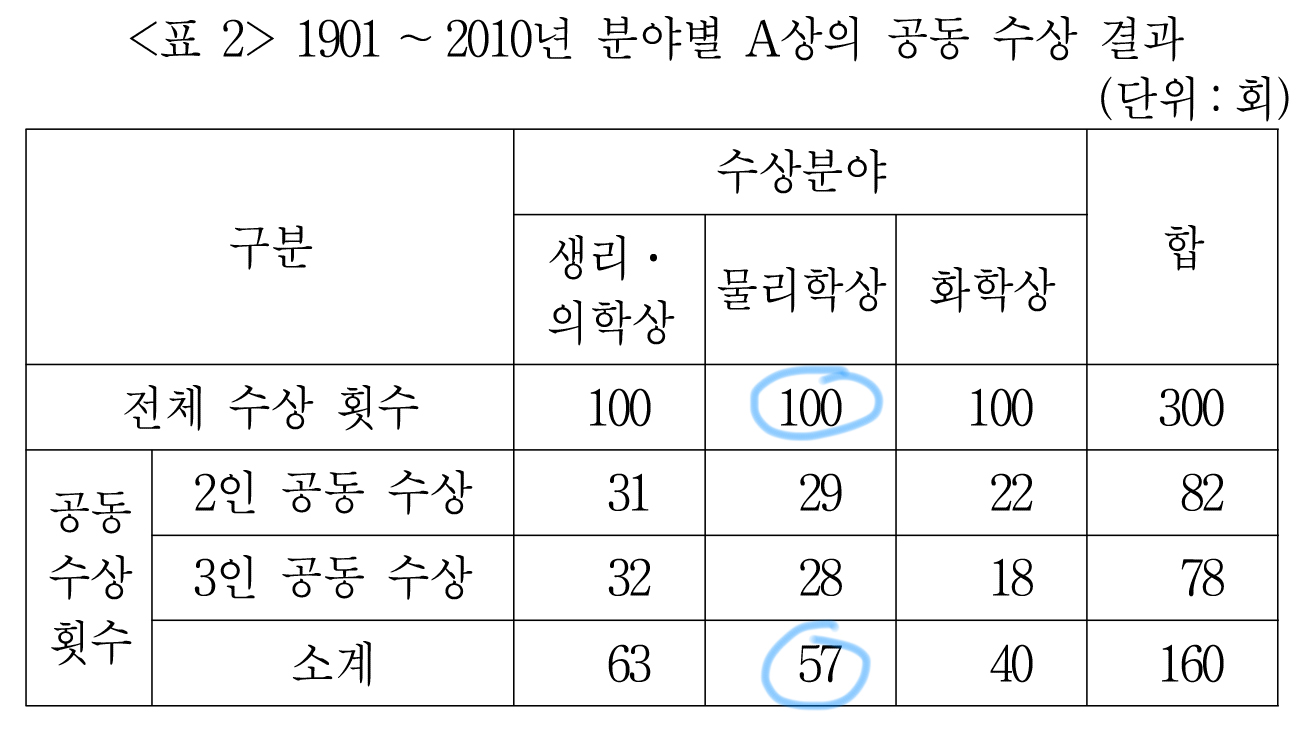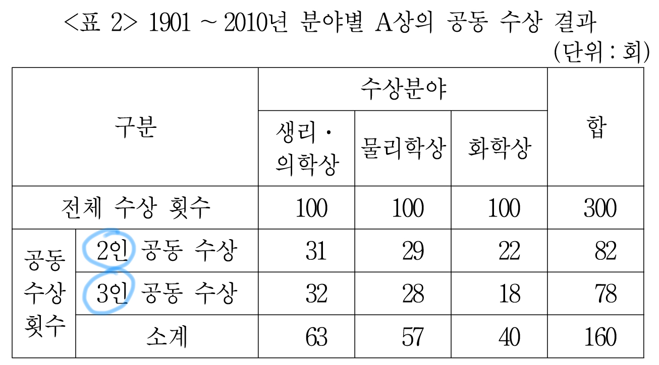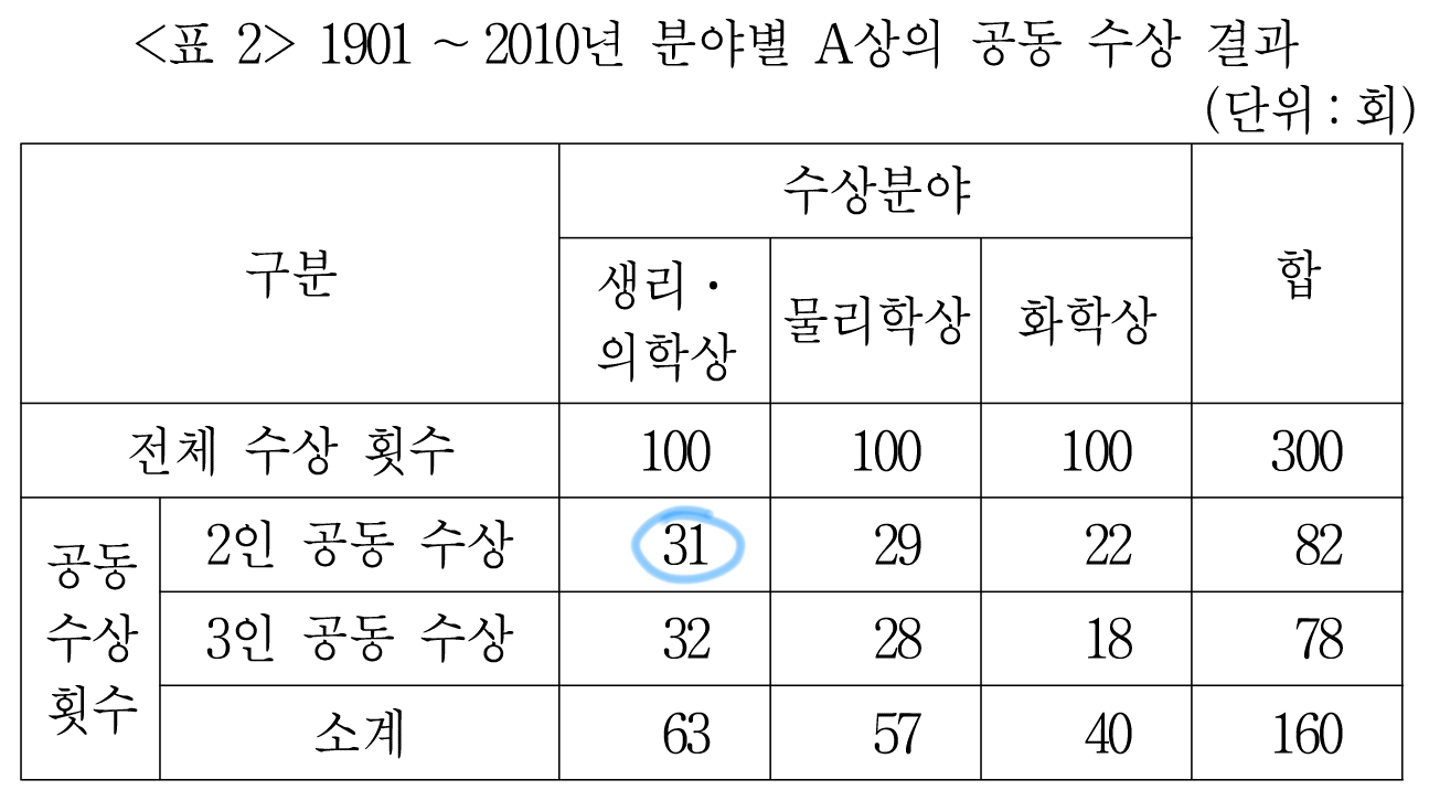 <표2>를 보니 2인 공동 수상도 있고, 3인 공동 수상도 있는데,
