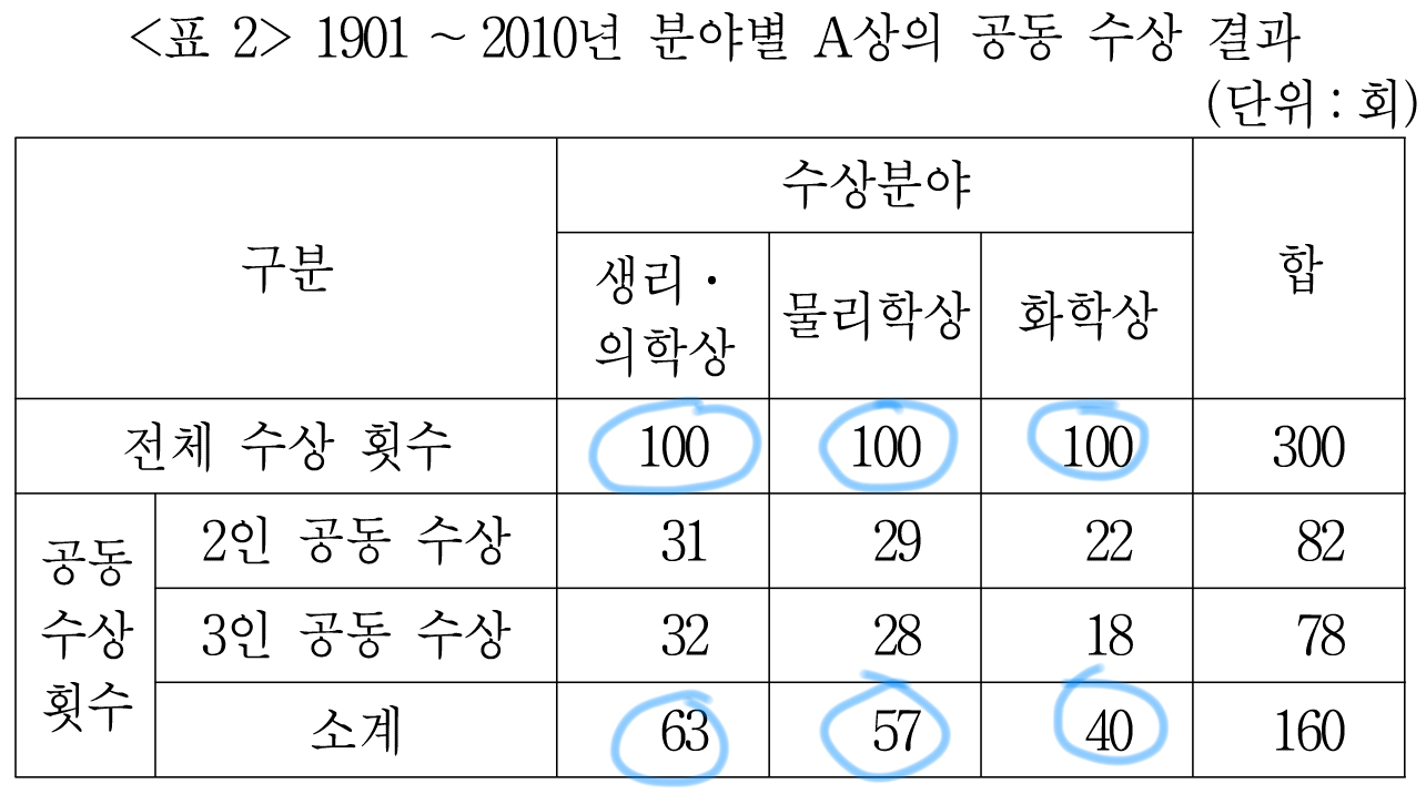 <표2>를 보니 2인 공동 수상도 있고, 3인 공동 수상도 있는데,