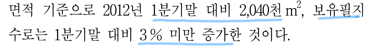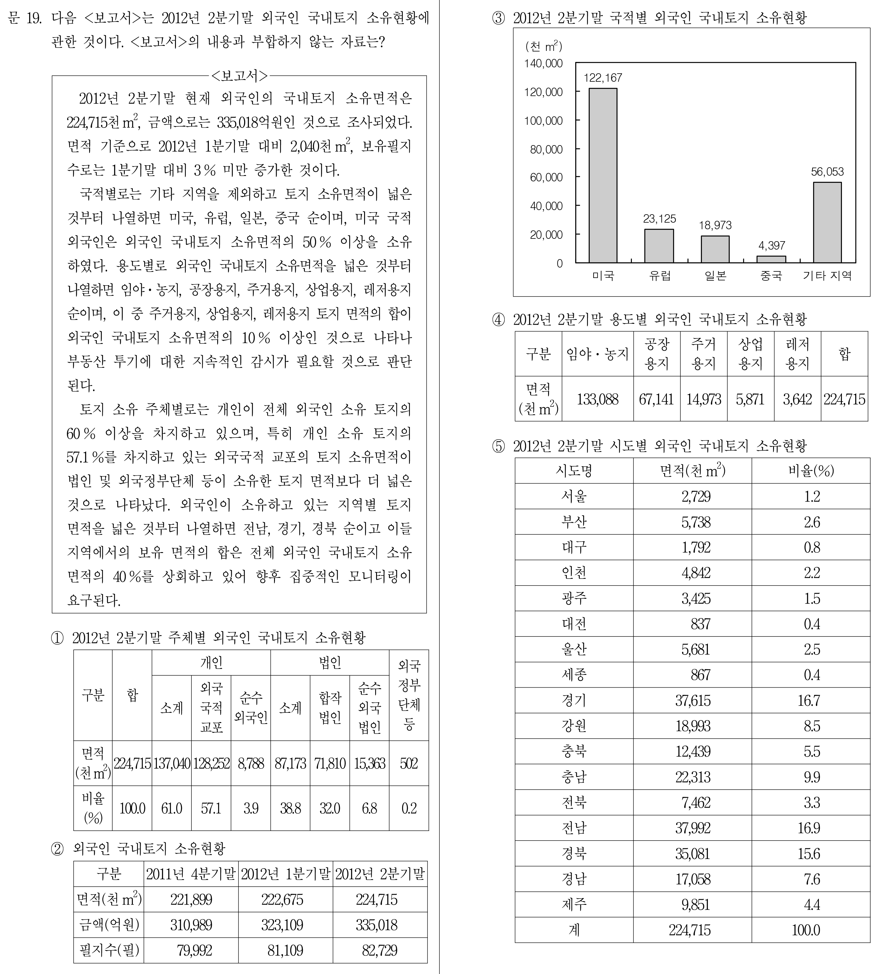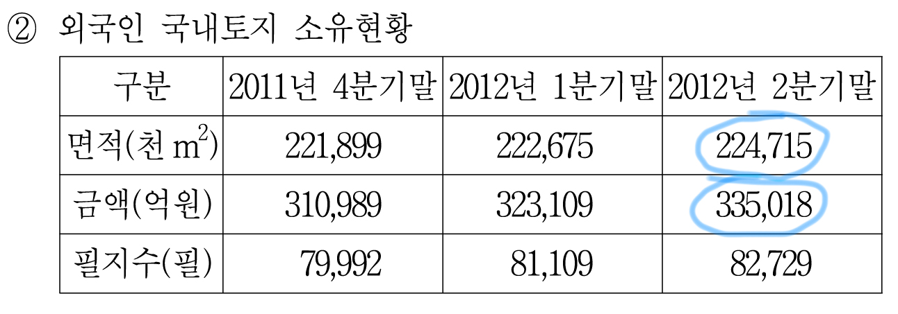 2012년 2분기 말 외국인 국내토지 소유면적은 1번과 2번에서 확인 가능하다.