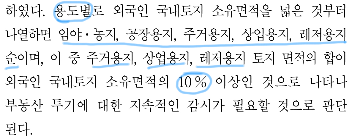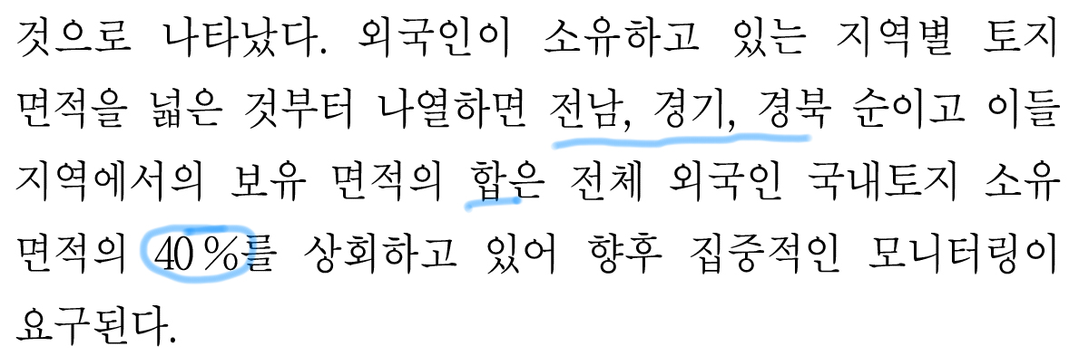일단 외국 국적 교포가 법인과 외국 정부 단체 등보다 더 많은 토지를 소유하고 있는지 확인해 보자.