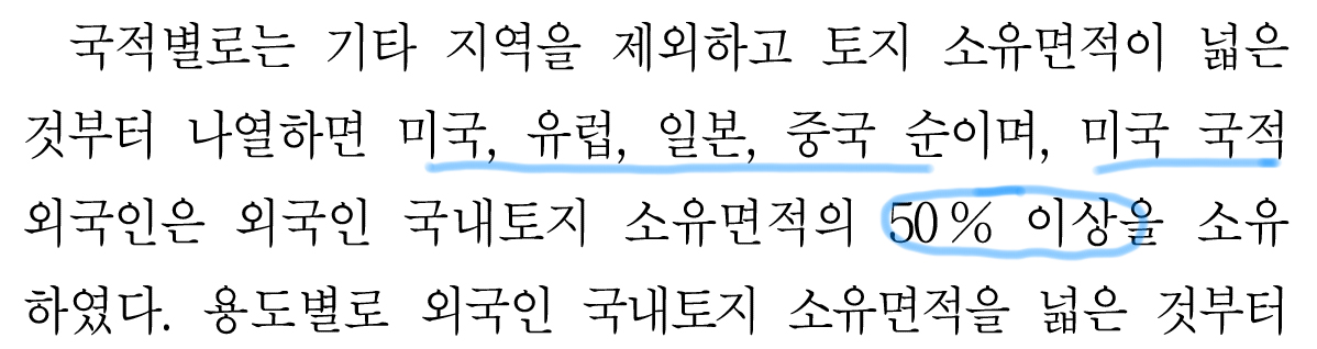 미국 국적 외국인이 외국인 소유 토지 50% 이상을 가지고 있음을 알 수 있다.