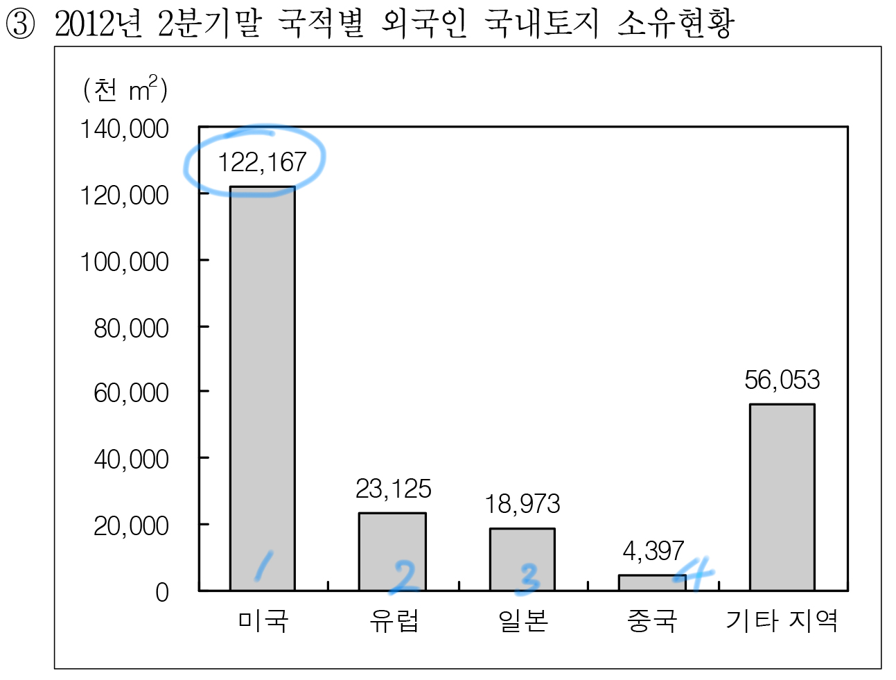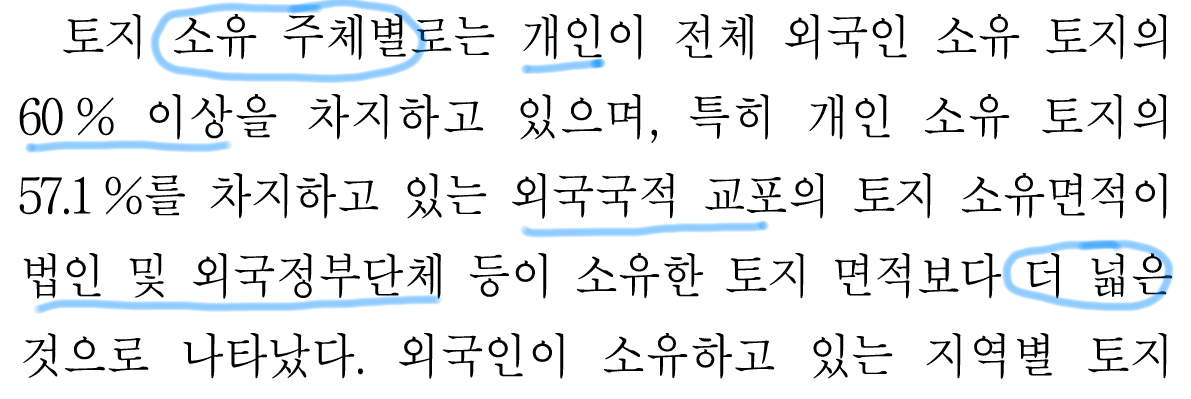 일단 외국 국적 교포가 법인과 외국 정부 단체 등보다 더 많은 토지를 소유하고 있는지 확인해 보자.