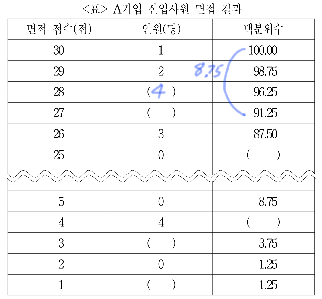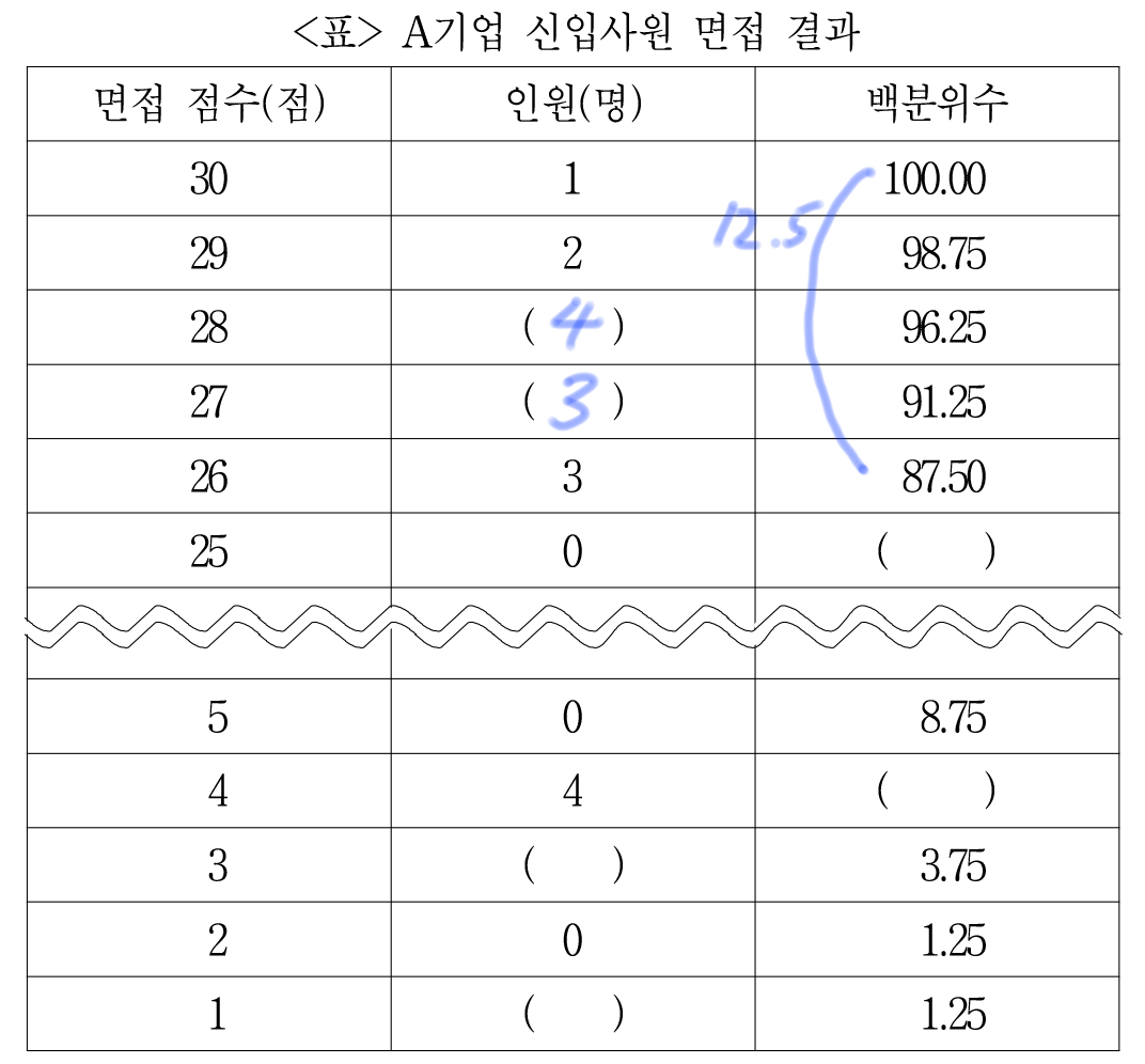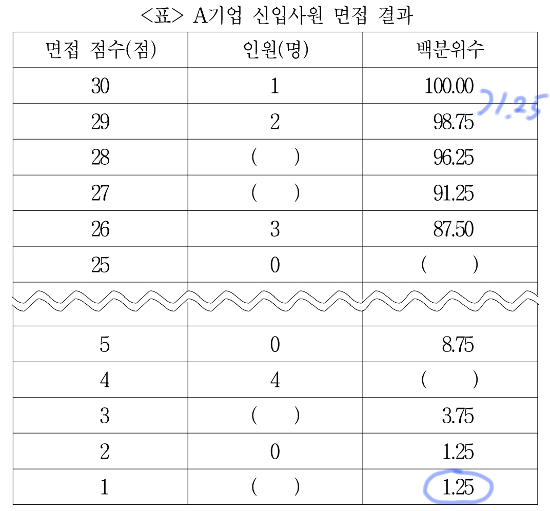29점을 받은 인원이 2명인데 백분위수는 1.25 차이 나니까