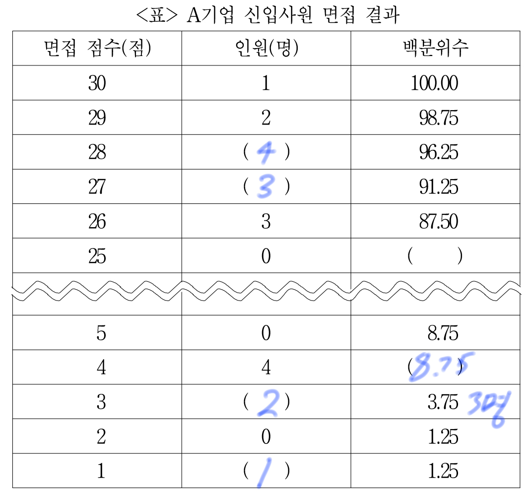 그럼 4점 이하 점수를 받은 면접자는 7명. 이는 8.75%p에 해당하므로