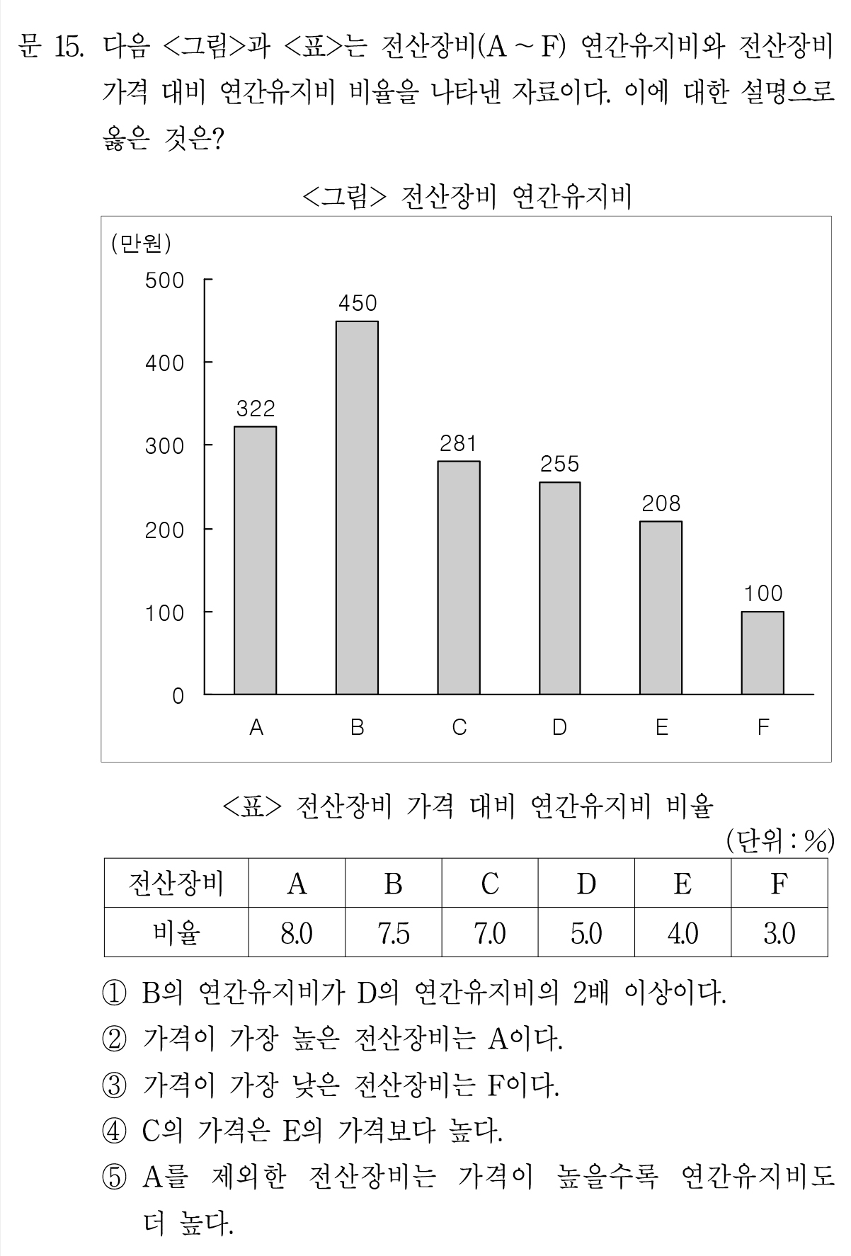 5번. A를 제외한 전산장비는 가격이 높을수록 연간유지비도 더 높다.