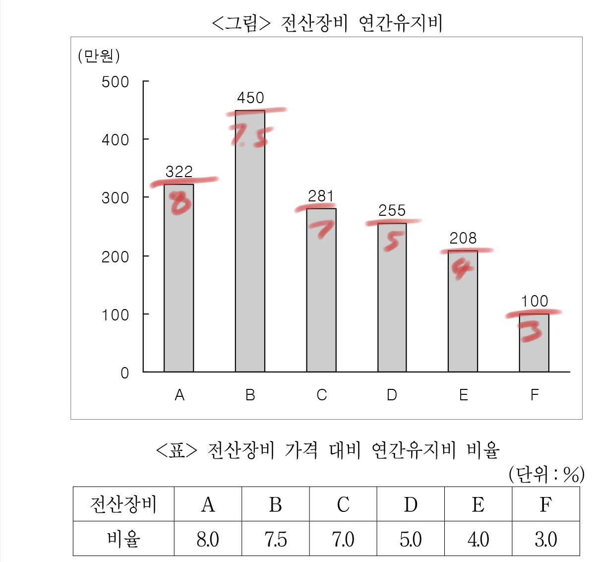 5번. A를 제외한 전산장비는 가격이 높을수록 연간유지비도 더 높다.
