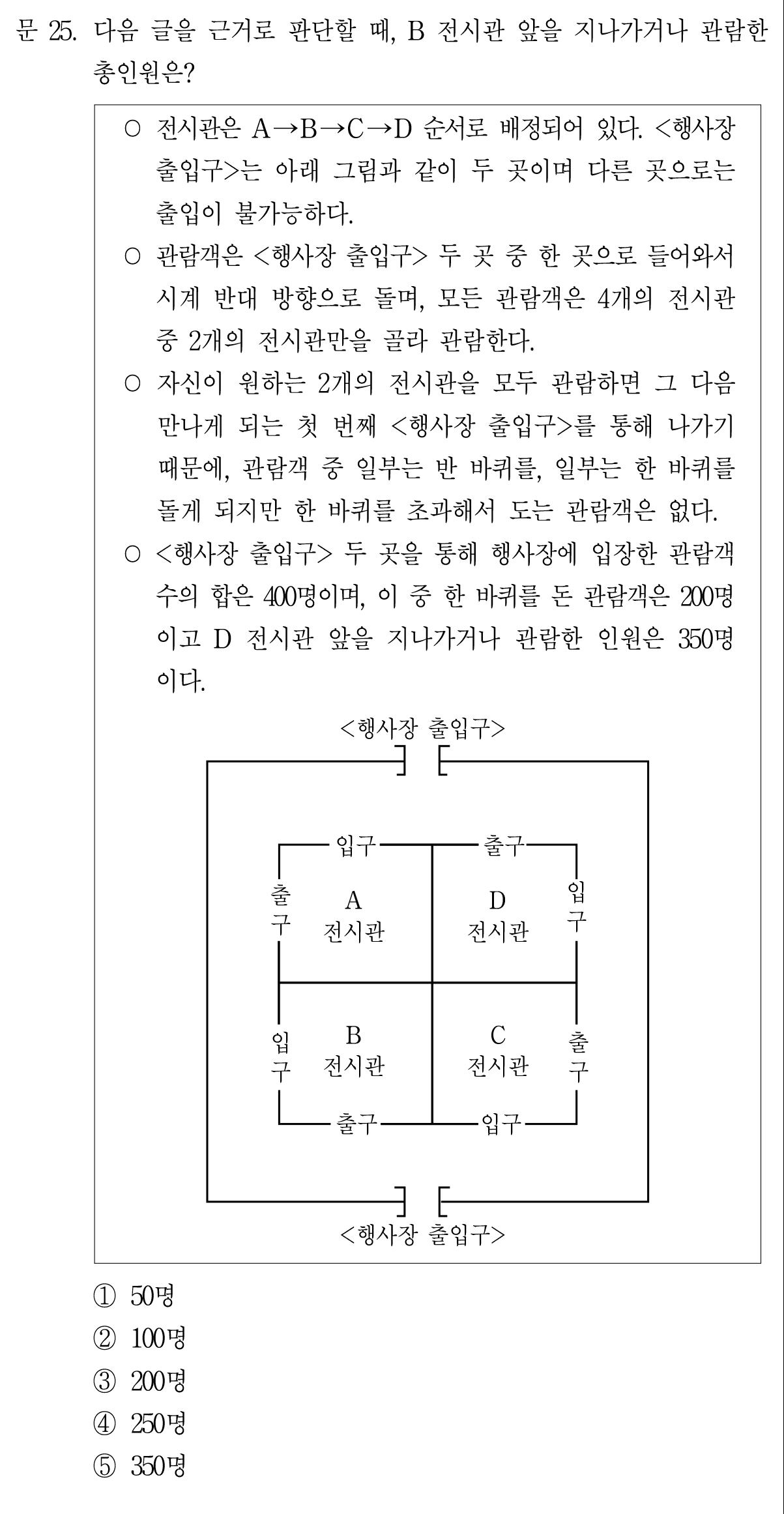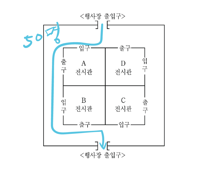 위쪽 출입구를 통해 들어와서 반바퀴만 돈 인원은 50명이라는 것을 알 수 있다.