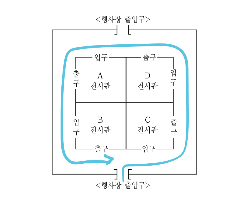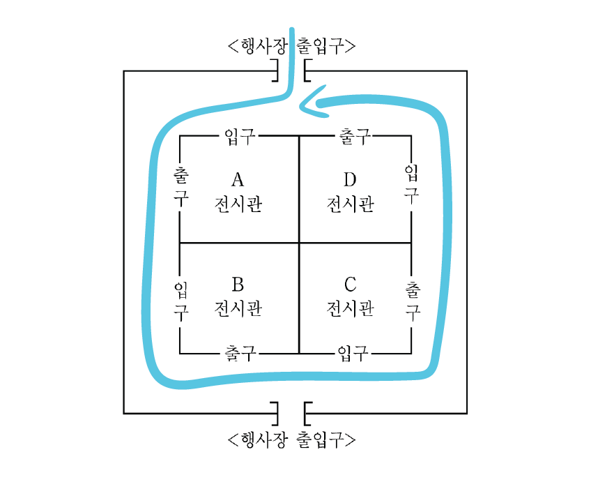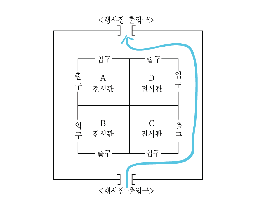 아래쪽 출입구를 통해 반바퀴 관람함으로써 D를 지나가거나 관람했다는 것을 알 수 있다.