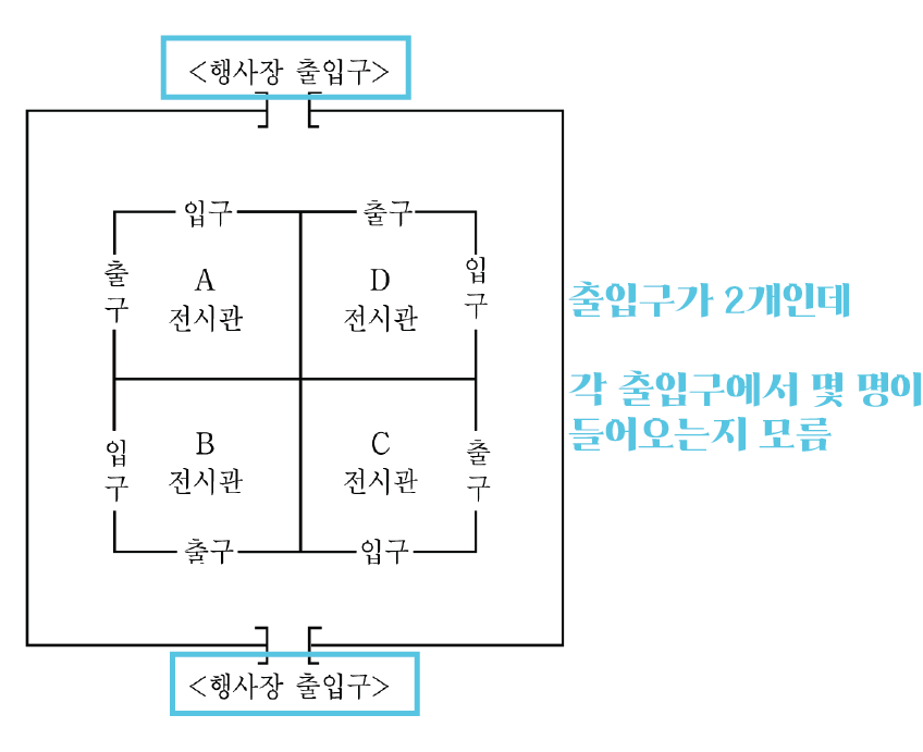 각 출입구에서 몇 명이 들어오는지 불확실. 그러나 총합은 400명