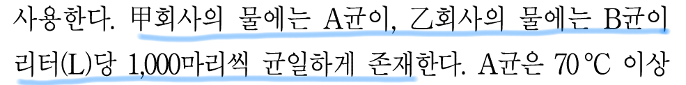 갑회사와 을회사의 물 모두 원래 1L 당 A균과 B균이 각각 1000마리씩 존재했지만