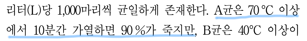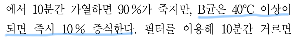 공정 (3)을 거친 물의 온도는 60도이기 때문에 B균이 즉시 10% 증식하게 되고,