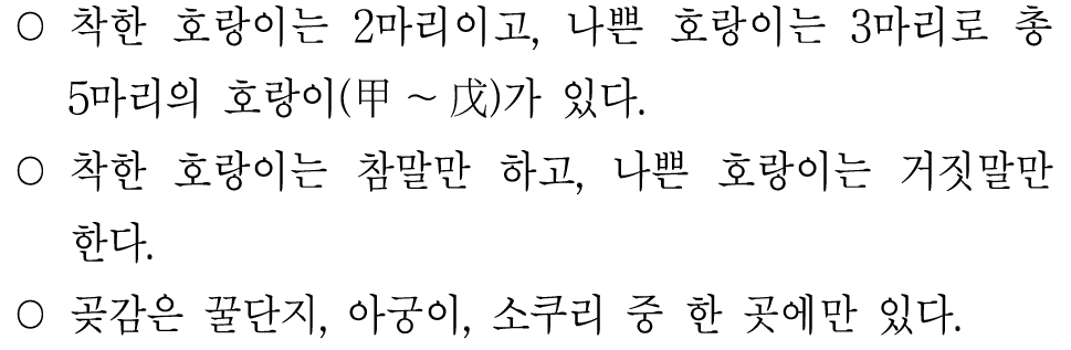 한편, 착한 호랑이는 3마리이므로 정은 착한 호랑이가 된다.