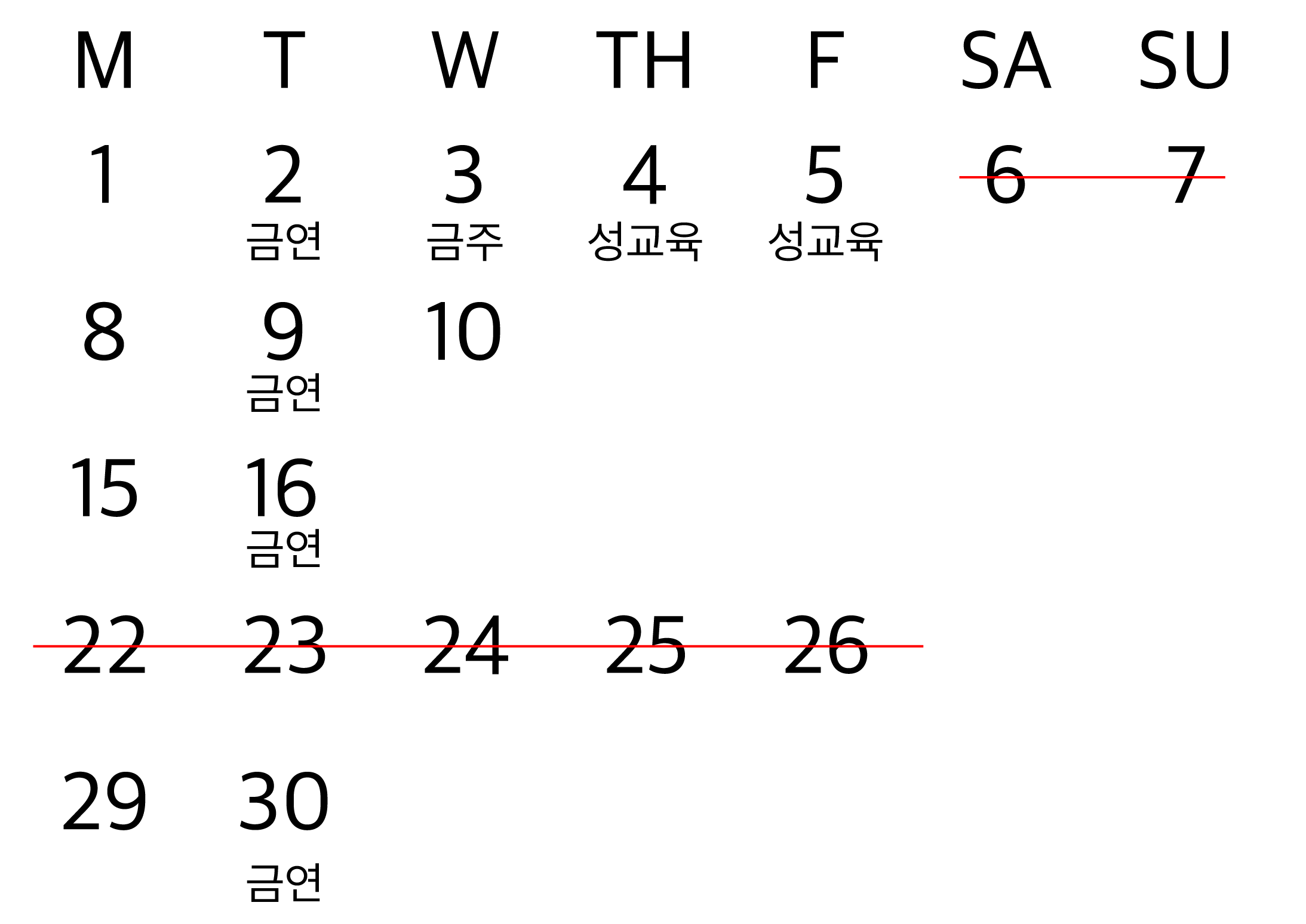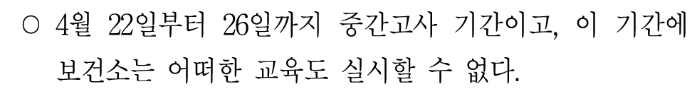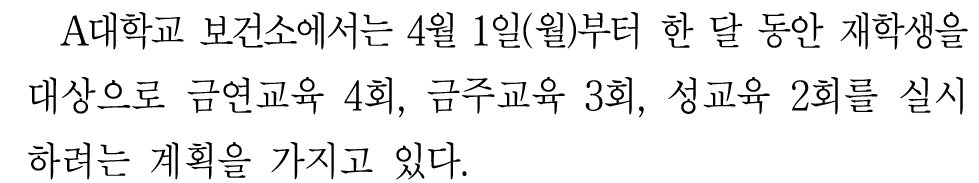 그렇다면 화요일에 금연교육을 실시한다면 나머지 주차의 화요일이 비어야 한다는 것이다.