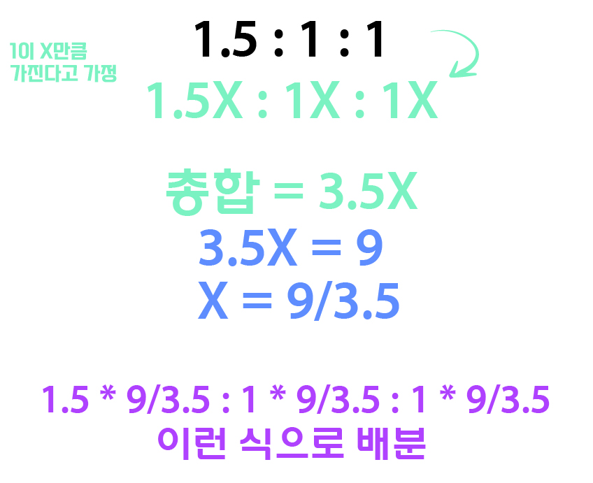 1.5 : 1 : 1로 9억을 배분할 때 B가 3억을 받게 되느냐?